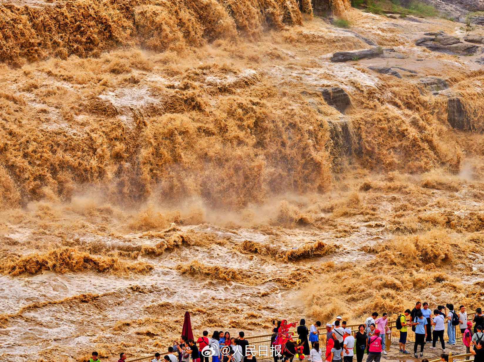 受上游降水影响,8月26日,黄河壶口瀑布迎来了令人瞩目的变化,主副瀑布紧密相连,成功再现壮美金黄色瀑布群,出现水岸齐平的景观。网友:现实版的黄河之水天上来!(摄影/史家民)