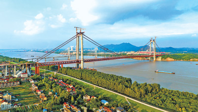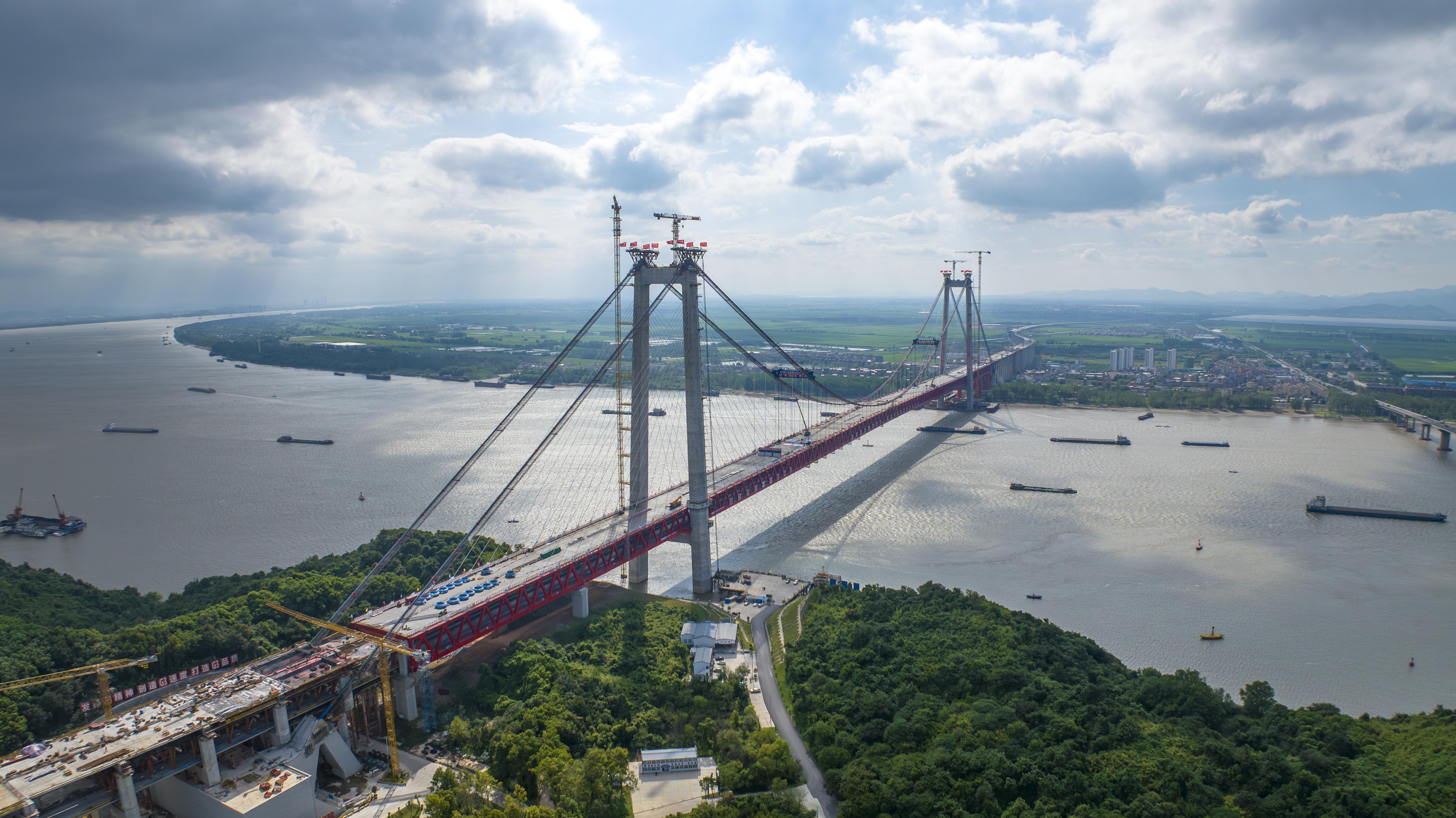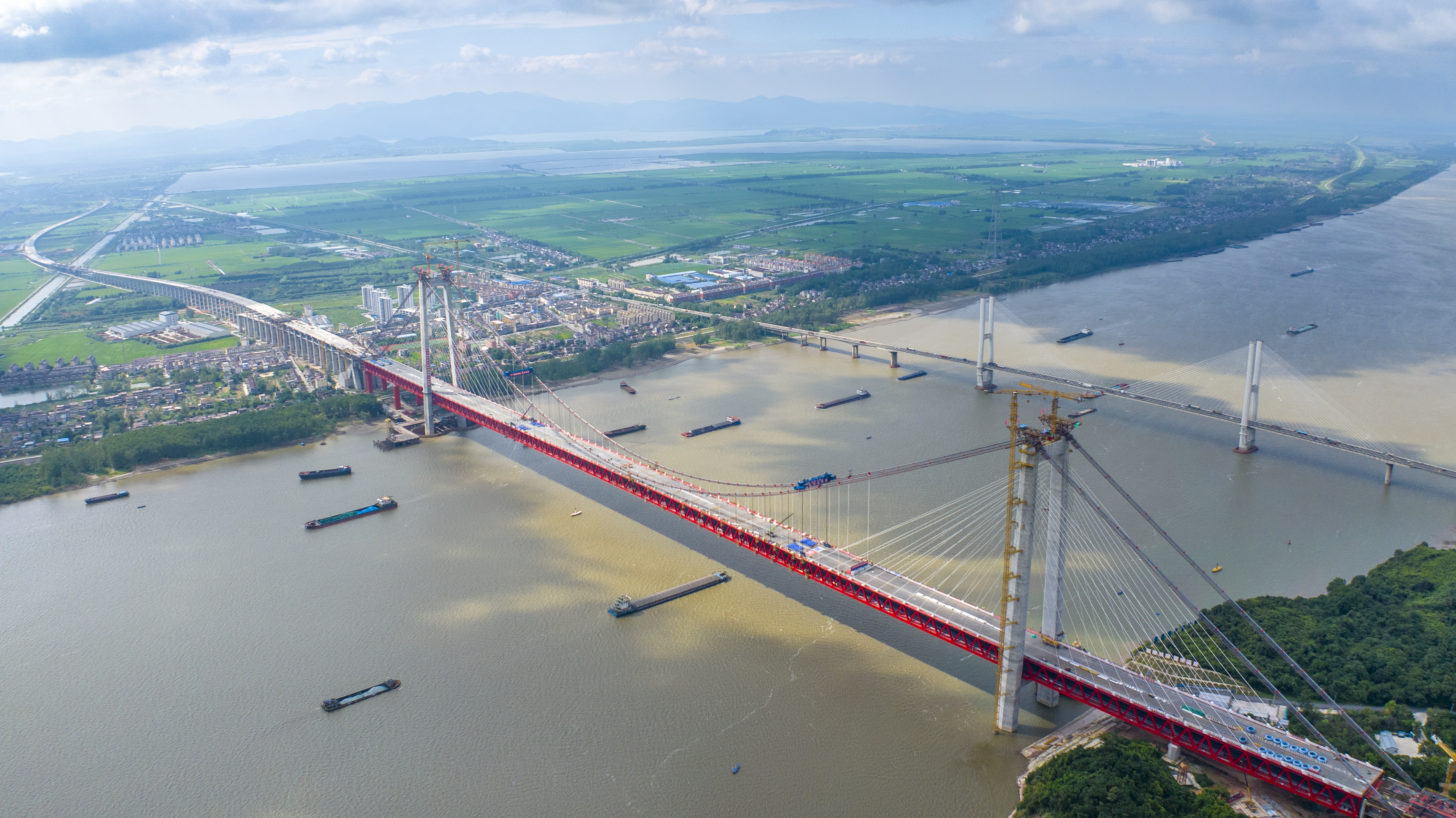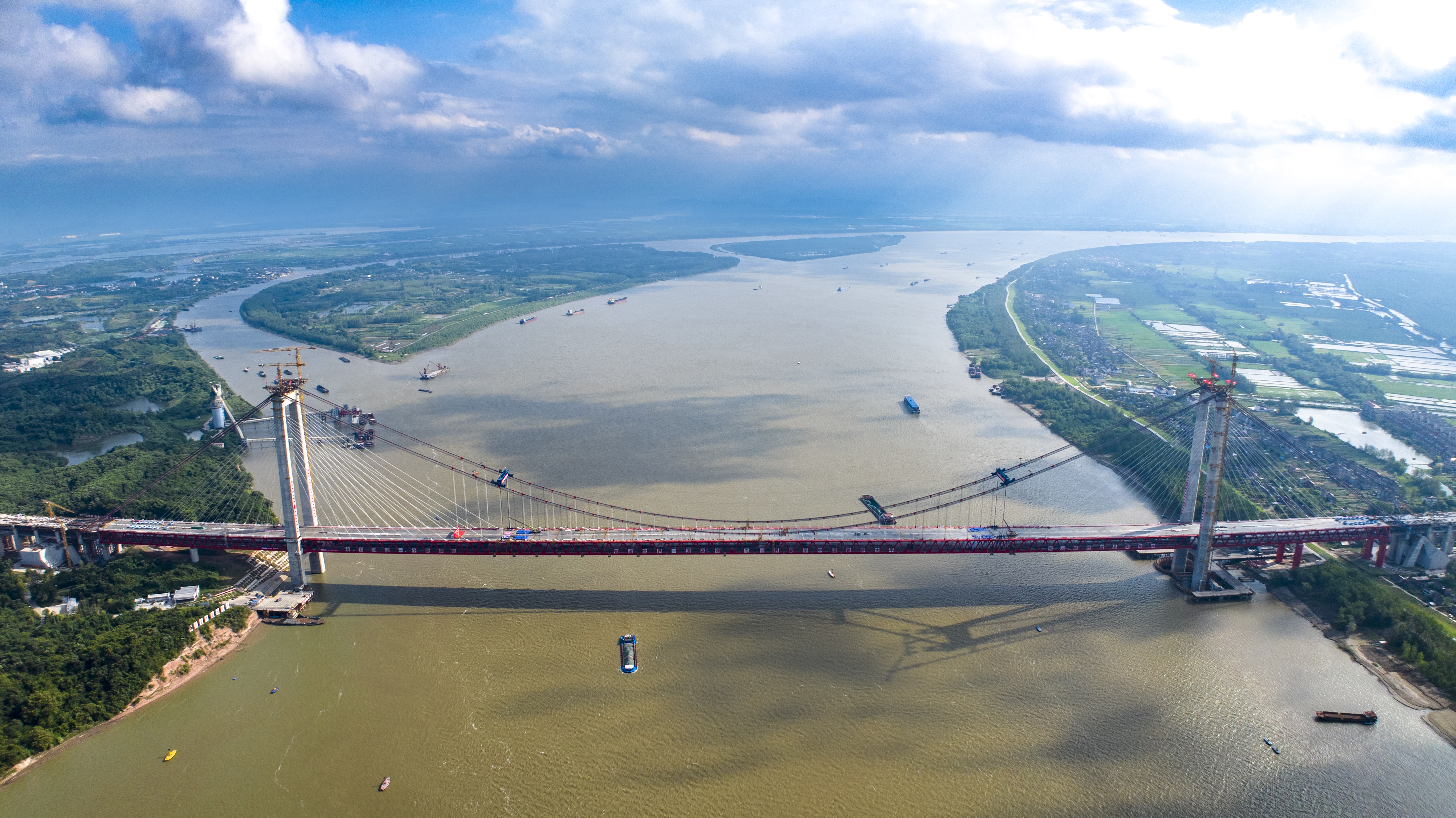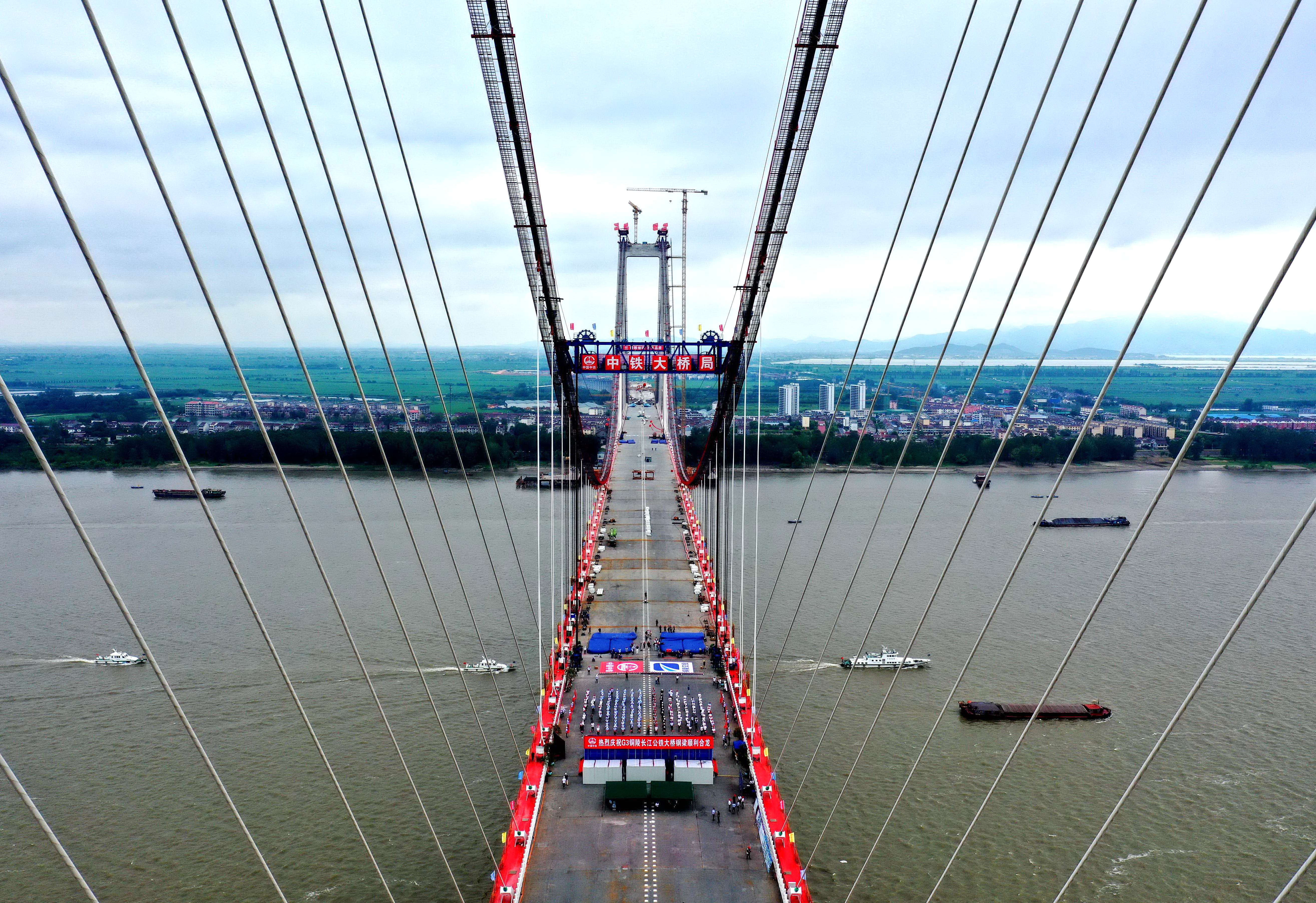 G3铜陵长江公铁大桥主桥8月27日顺利合龙,标志着世界首座双层斜拉—悬索协作体系大桥主体完工。大桥路线全长11.88公里,主跨988米,上层桥面布置为上下6车道高速公路,下层桥面布置为上下4线铁路。