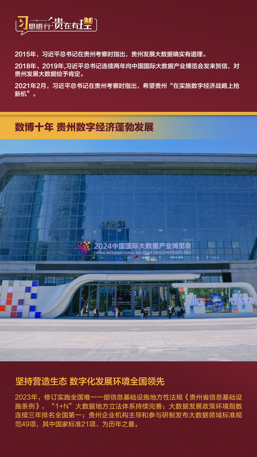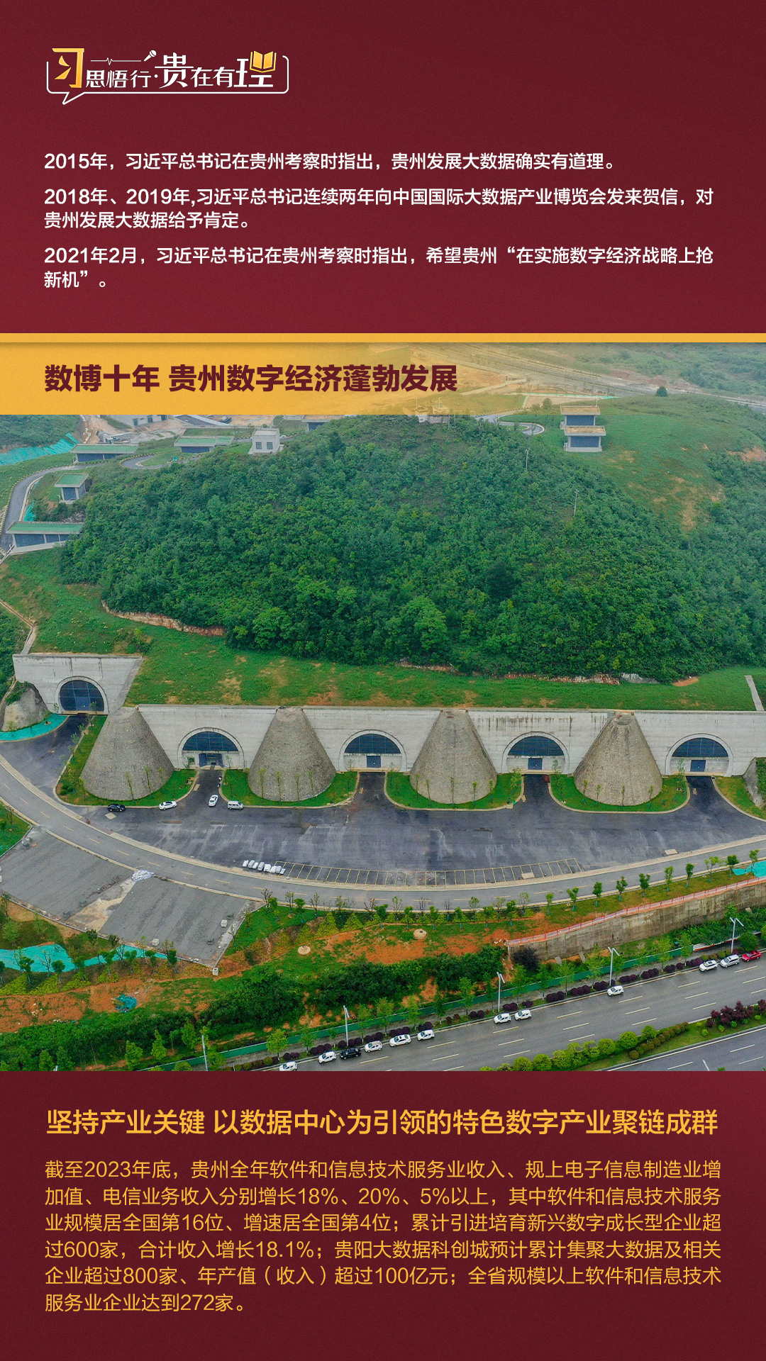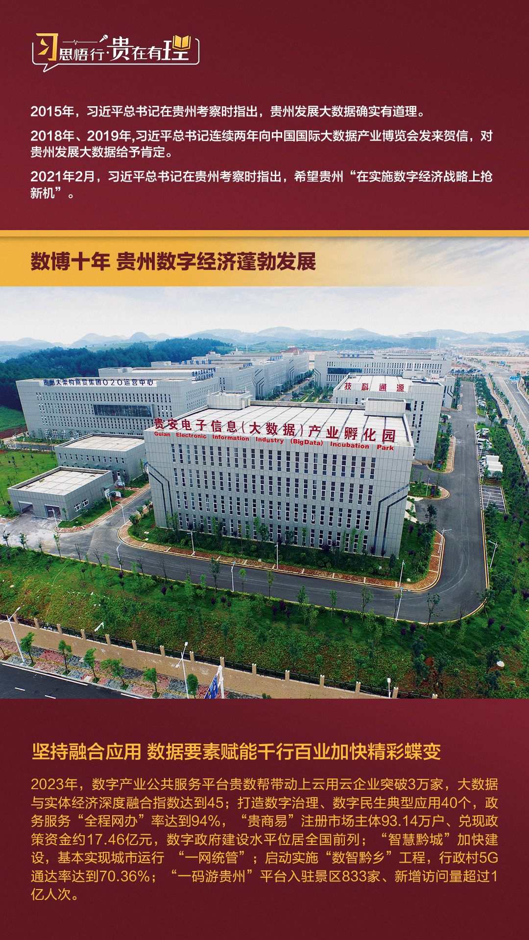 2015年,习近平总书记考察贵州时指出,贵州发展大数据确实有道理。2018年、2019年,习近平总书记连续两年向中国国际大数据产业博览会发来贺信,对贵州发展大数据给予肯定。2021年2月,习近平总书记在贵州考察时指出,希望贵州“在实施数字经济战略上抢新机”。总书记的重要指示,为贵州进一步发展大数据指明了方向、提供了遵循。数博十年,贵州大数据产业从无到有,数字经济实现蓬勃发展。