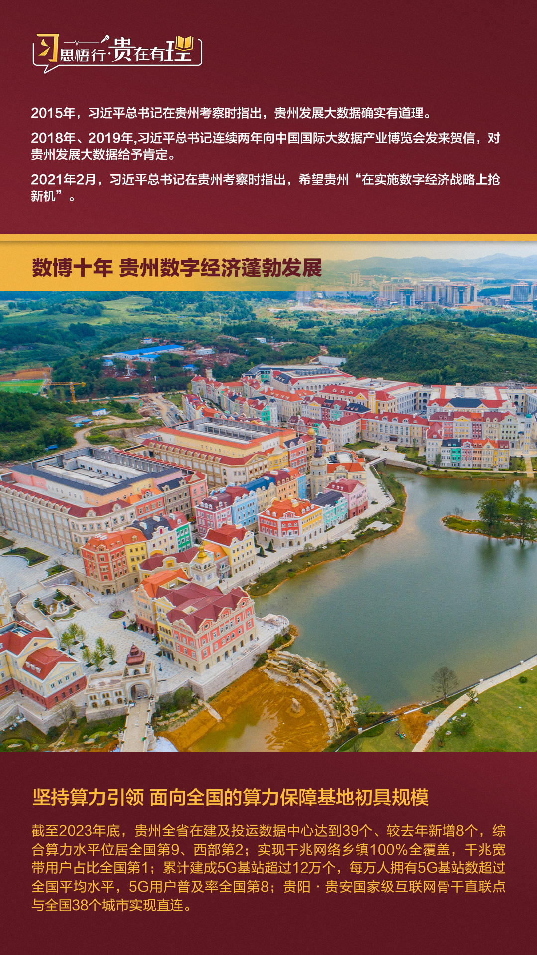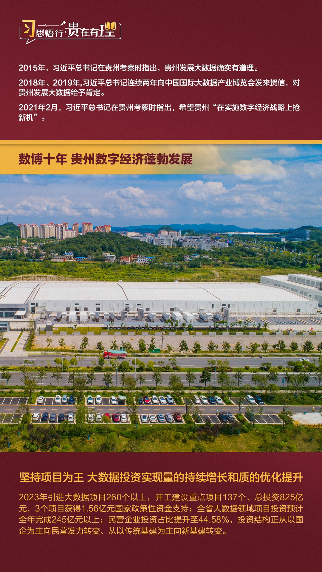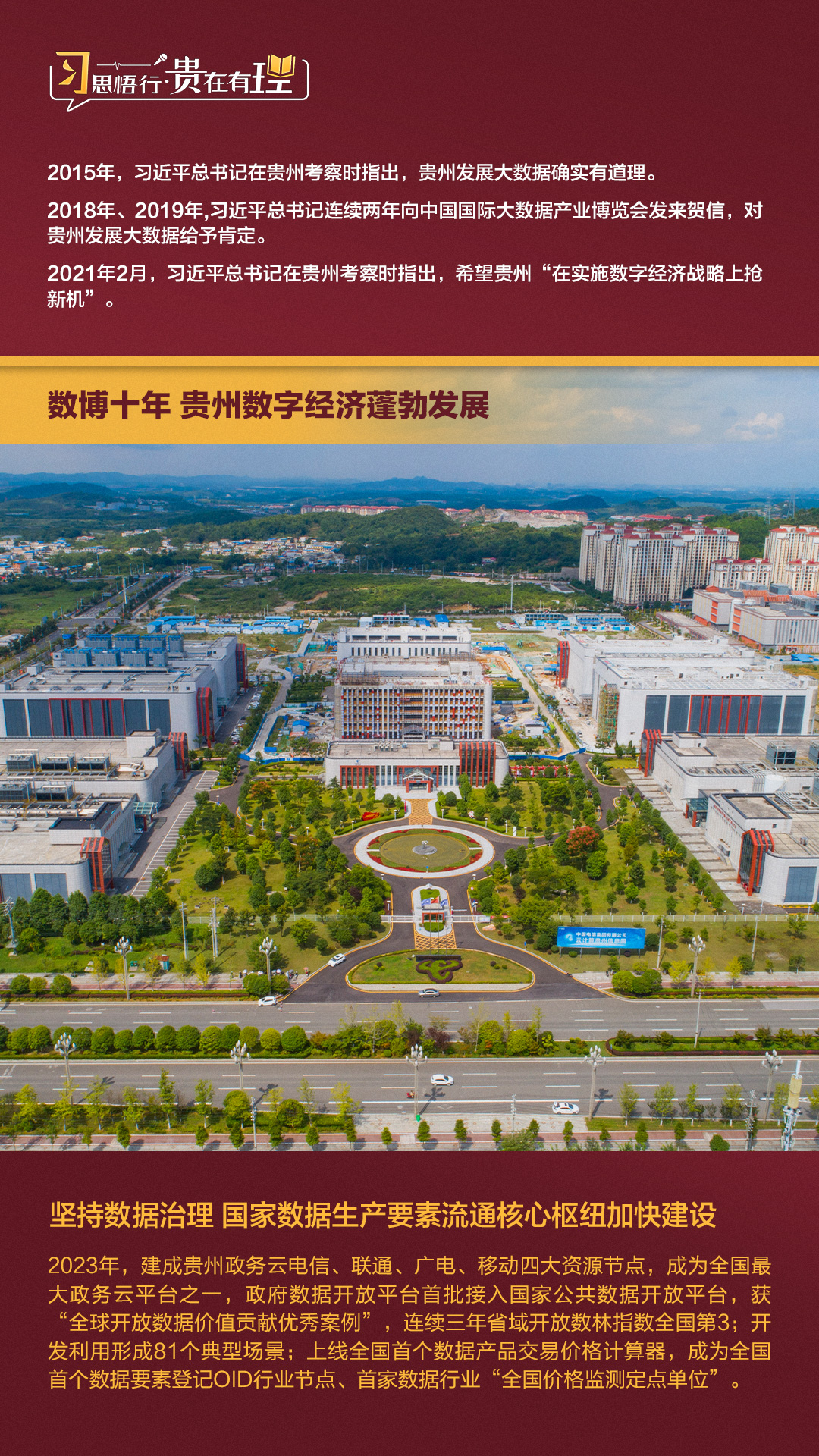 2015年,习近平总书记考察贵州时指出,贵州发展大数据确实有道理。2018年、2019年,习近平总书记连续两年向中国国际大数据产业博览会发来贺信,对贵州发展大数据给予肯定。2021年2月,习近平总书记在贵州考察时指出,希望贵州“在实施数字经济战略上抢新机”。总书记的重要指示,为贵州进一步发展大数据指明了方向、提供了遵循。数博十年,贵州大数据产业从无到有,数字经济实现蓬勃发展。