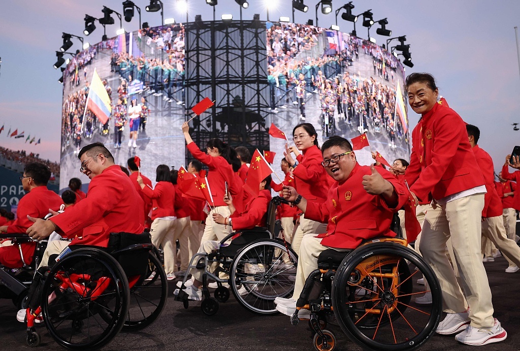 开幕式上,女子轮椅击剑运动员辜海燕和男子举重运动员齐勇凯作为中国体育代表团旗手,手持五星红旗入场。
