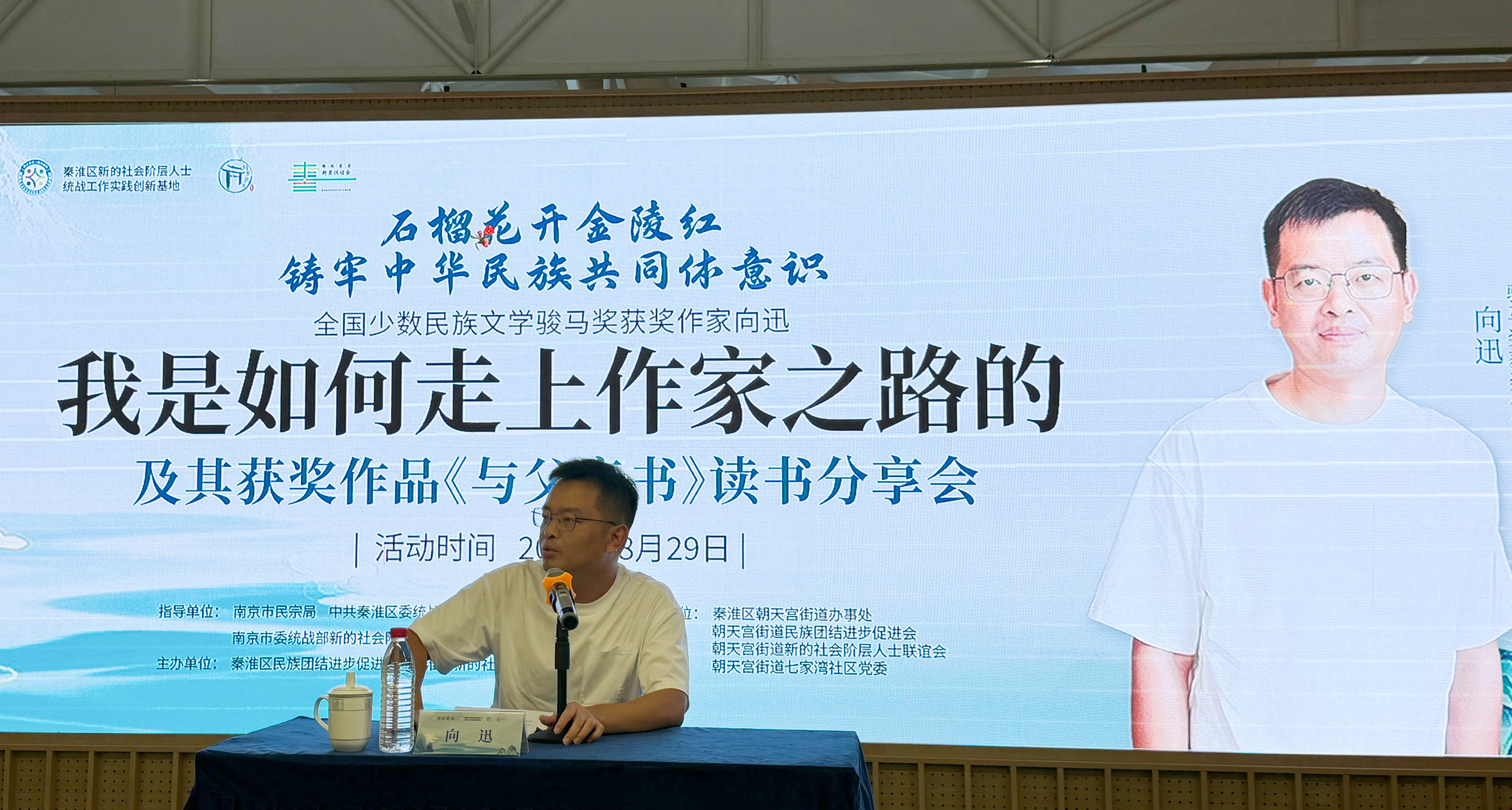 本次分享活动,由南京市民宗局、秦淮区委统战部、南京市委统战部新的社会阶层处、南京市民族团结进步促进会指导,秦淮区民族团结进步促进会、秦淮区新的社会阶层人士联谊会主办,秦淮区朝天宫街道办事处、朝天宫街道民族团结进步促进会、朝天宫街道新的社会阶层人士联谊会、朝天宫街道七家湾社区党委承办,是“石榴花开金陵红 铸牢中华民族共同体意识”中的一项重要活动,旨在进一步增强不同区域不同民族不同文化的交往交流交融,发挥民族文学作品彰显中华文化的价值作用,讲好中华民族共同体故事。