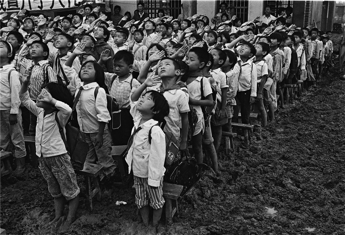 1992年9月1日,江苏省第一所希望小学——盱眙县希望小学落成后的首场开学典礼上,升旗仪式正在举行。300多名新生卷着裤腿,赤脚踏在泥泞里,小脸如向日葵般仰起,望向五星红旗的目光里写满了懵懂、兴奋和憧憬。