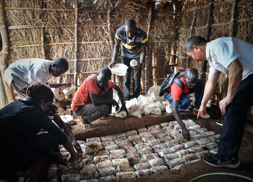 8月14日,在卢旺达南方省穆汉加区,尼扬博·奥贝德在食用菌培育工坊内检查菌袋。曾两次赴中国进行菌草技术培训的尼扬博·奥贝德在南方省和东方省各拥有一家工坊。