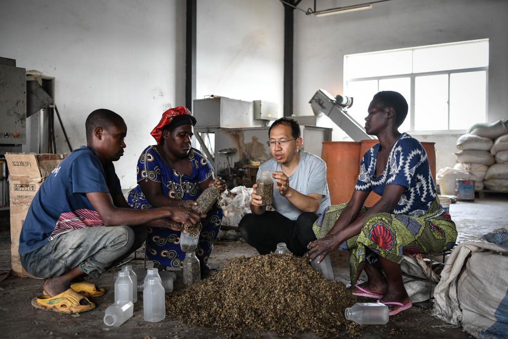 8月14日,在卢旺达南方省尼安萨区的一家食用菌培育工坊,菌草专家陈晓斌与工坊主人卡纳尼·埃纳尼交流。