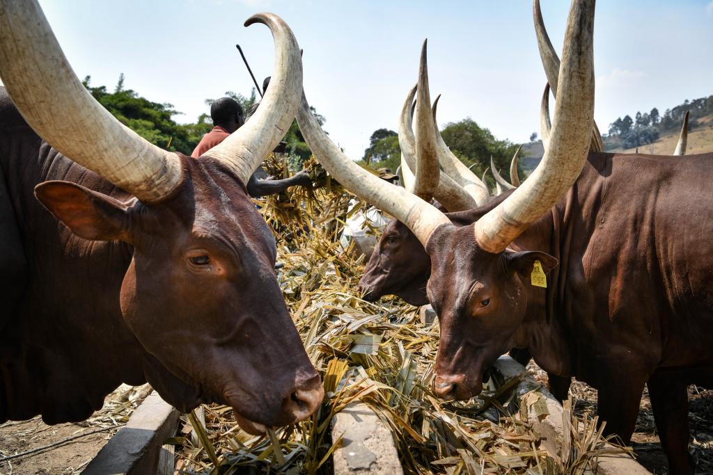 8月14日,在卢旺达南方省的一处牧场,牲畜食用菌草饲料。