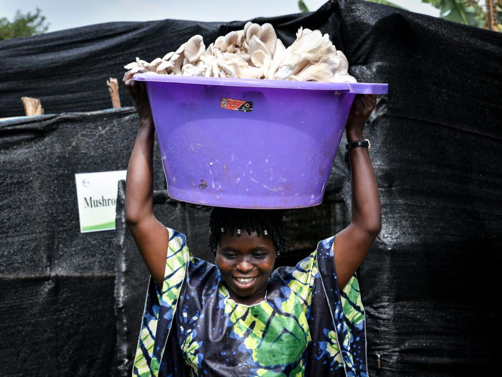 在中非共和国达马拉市一处贫困村落里,法蒂姆·阿巴·雷基亚正在自家的菇棚内收获鲜菇。