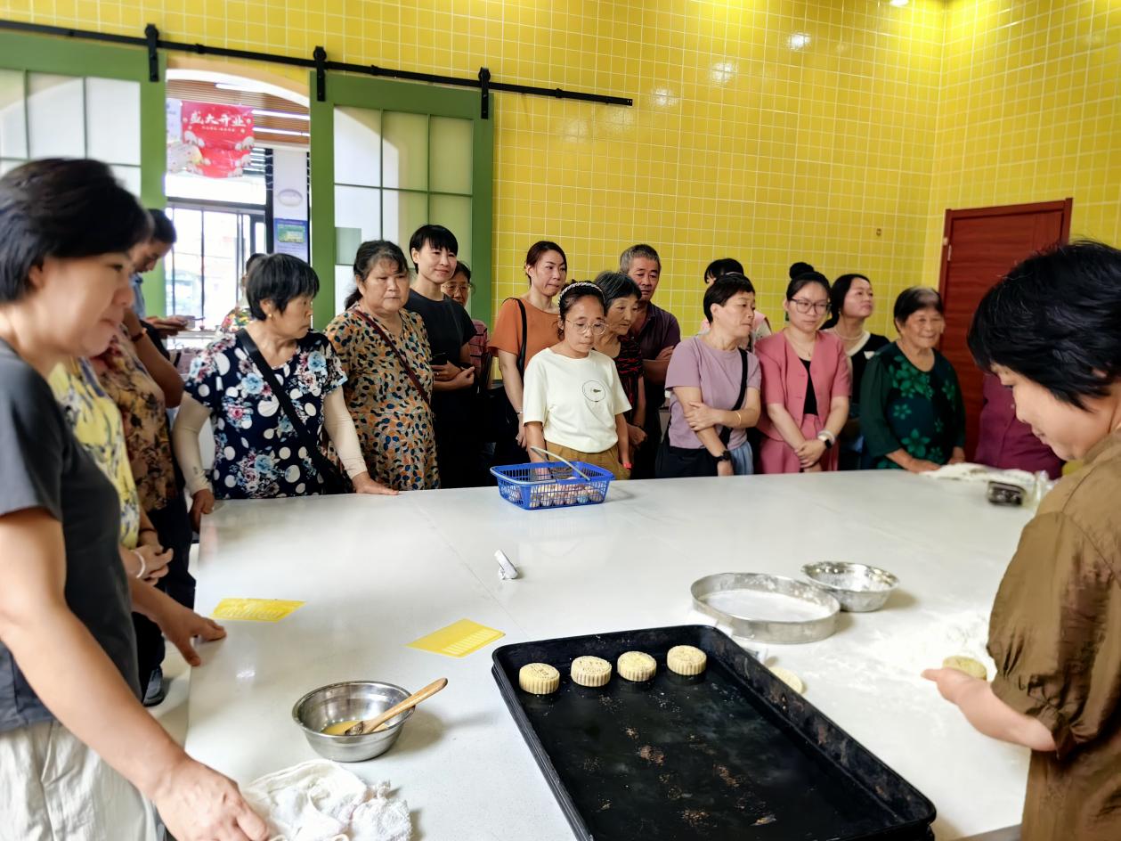 本次培训特邀漕塘信用食品厂黄三忠老师傅现场传授月饼、糕点等制作技艺。黄师傅从事糕点制作30余年,精通各类中式面点制作,本次培训,重点制作各式各样的月饼、片糕等糕点。黄三忠师傅严格按照教学计划实施现场教学,在培训学习中采取“理论+实操”的教学方法,确保学员能学有所获,学有所成。现场职工学员们边看边学边试做起月饼来。不一会儿,色香味俱全的月饼就出炉了,制作好的月饼、片糕等甜品摆放在室外的展台处,许多市民停下脚步,细细品味并选购。