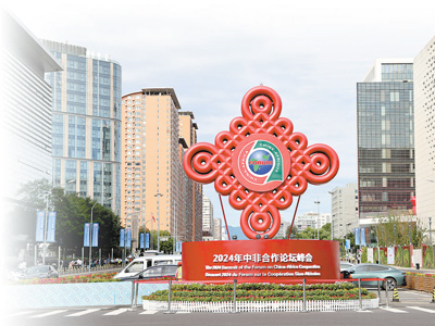 国家会议中心外的2024年中非合作论坛北京峰会主题雕塑。本报记者 孟祥麟摄