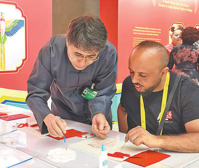 在2024年中非合作论坛北京峰会新闻中心,来自阿尔及利亚的记者体验北京传统风筝制作。本报记者 王新萍摄