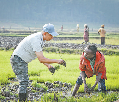 8月14日,在卢旺达南方省胡耶区的中国援卢旺达农业技术示范中心,中国水稻专家指导当地稻农进行秧苗移栽。新华社记者 韩旭摄