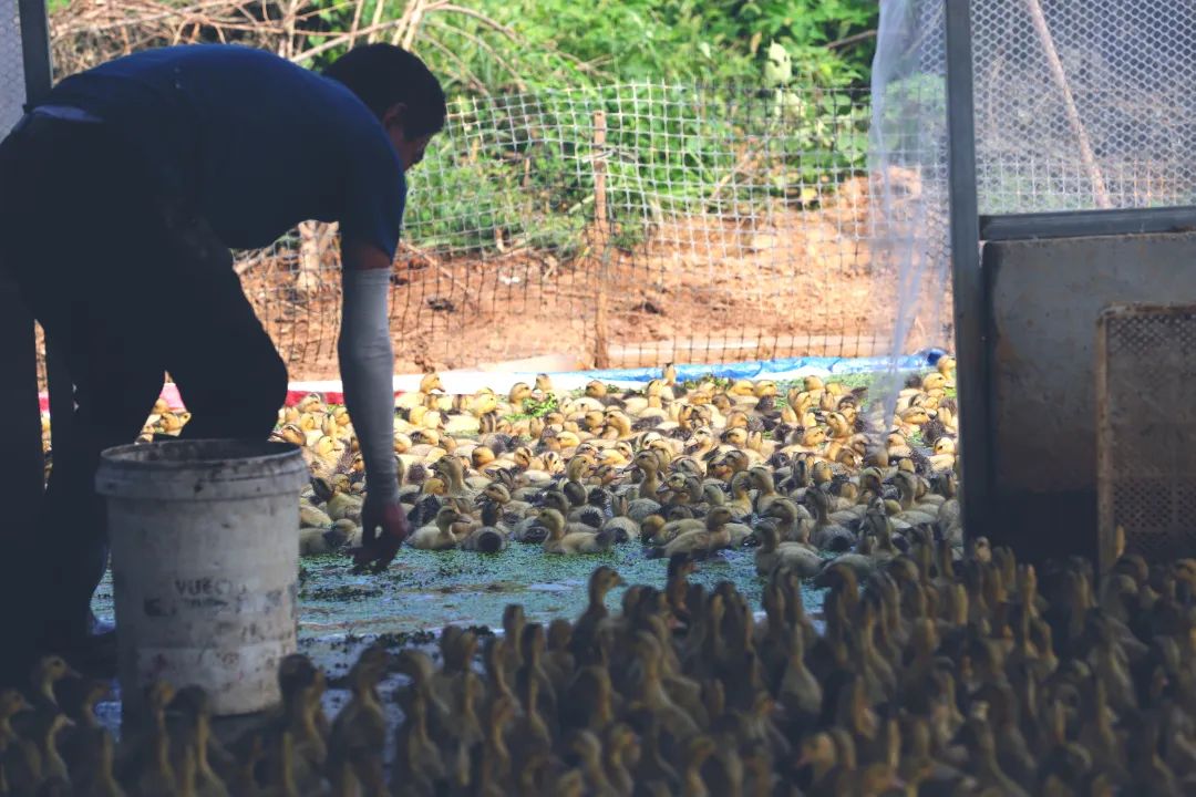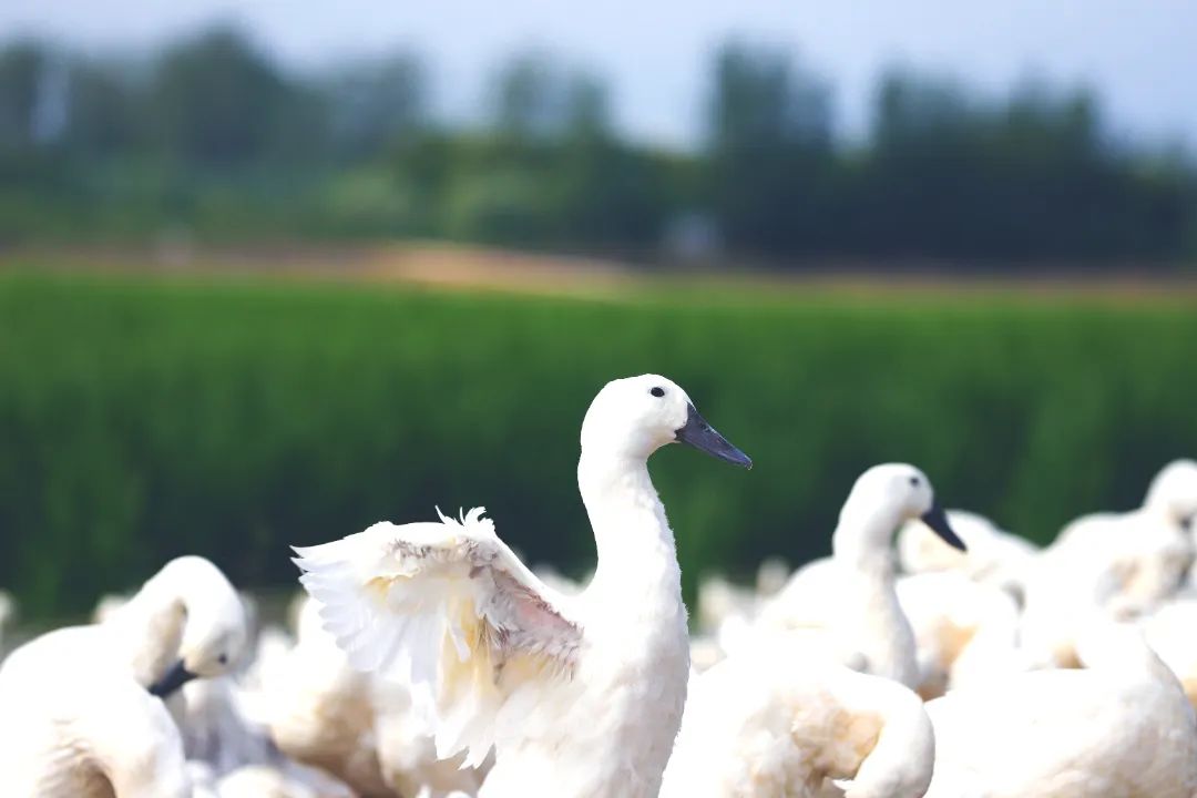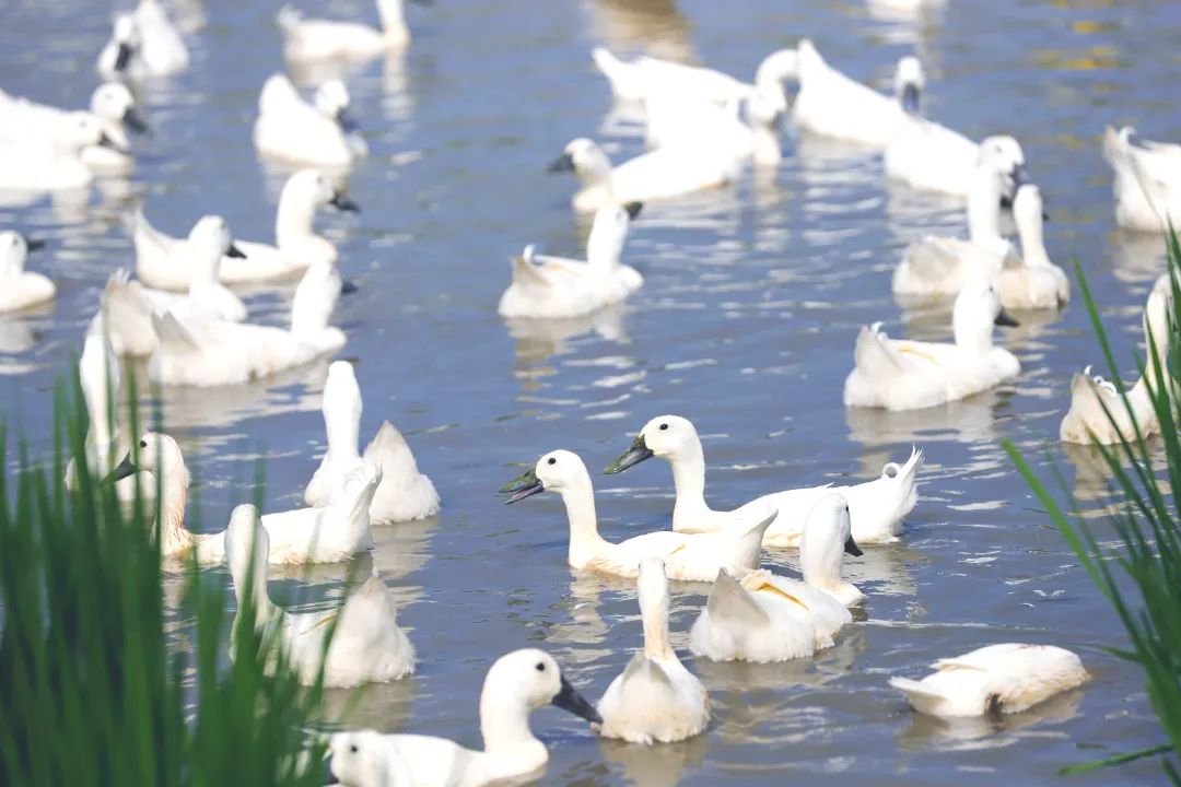 “稻鸭共养”是一种生态绿色型种养模式,利用稻田鸭在水稻间脚踩、嘴拱的觅食方式能够刺激水稻根茎生长,排泄的粪便亦可作为水稻生长的天然有机肥,能够很大程度减少农药、化肥的使用量。同时,稻田中的浮萍、害虫均可作为稻田鸭的食物,减少饲料的投喂,充分保障稻田鸭的高品质口感和高营养价值。一地两用、一水两养,友联村正聚力探索一条“稻鸭共养”的乡村振兴致富路。