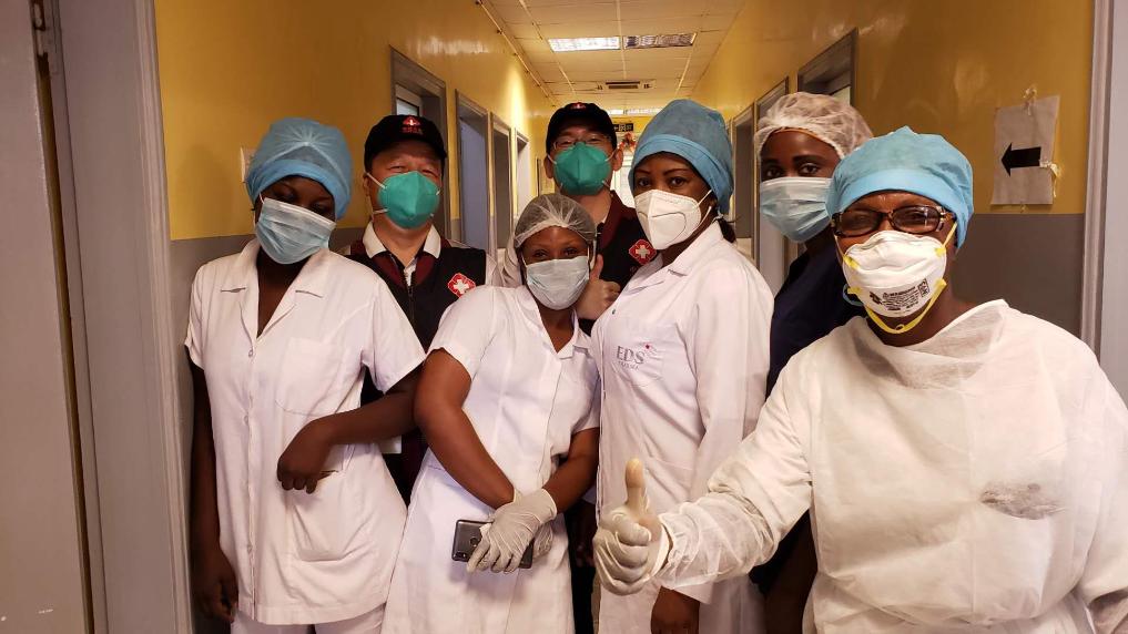 2020年5月26日,中国抗疫医疗专家组在刚果(布)首都布拉柴维尔指导新冠肺炎病房建设时,与当地一线医务人员合影。新华社发