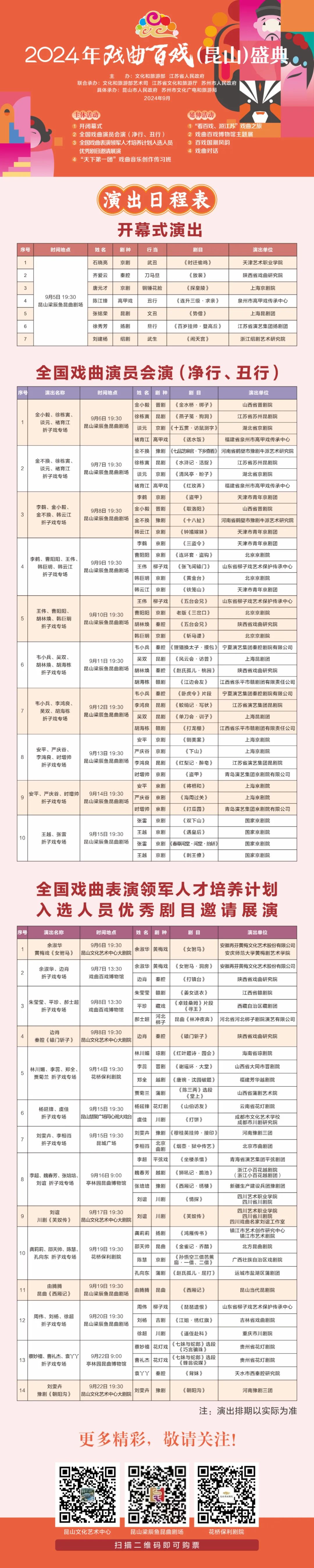 除了开闭幕演出,今年戏曲百戏(昆山)盛典还将安排全国戏曲演员会演(净行、丑行)、全国戏曲表演领军人才培养计划入选人员优秀剧目邀请展演、“天下第一团”戏曲音乐创作传习班等四大主体活动。会演和展演既有黄梅戏《女驸马》、川剧《芙奴传》、昆剧《西厢记》等古装戏,也有豫剧《朝阳沟》等现代戏,充分彰显中国戏曲的丰厚底蕴和创新活力。