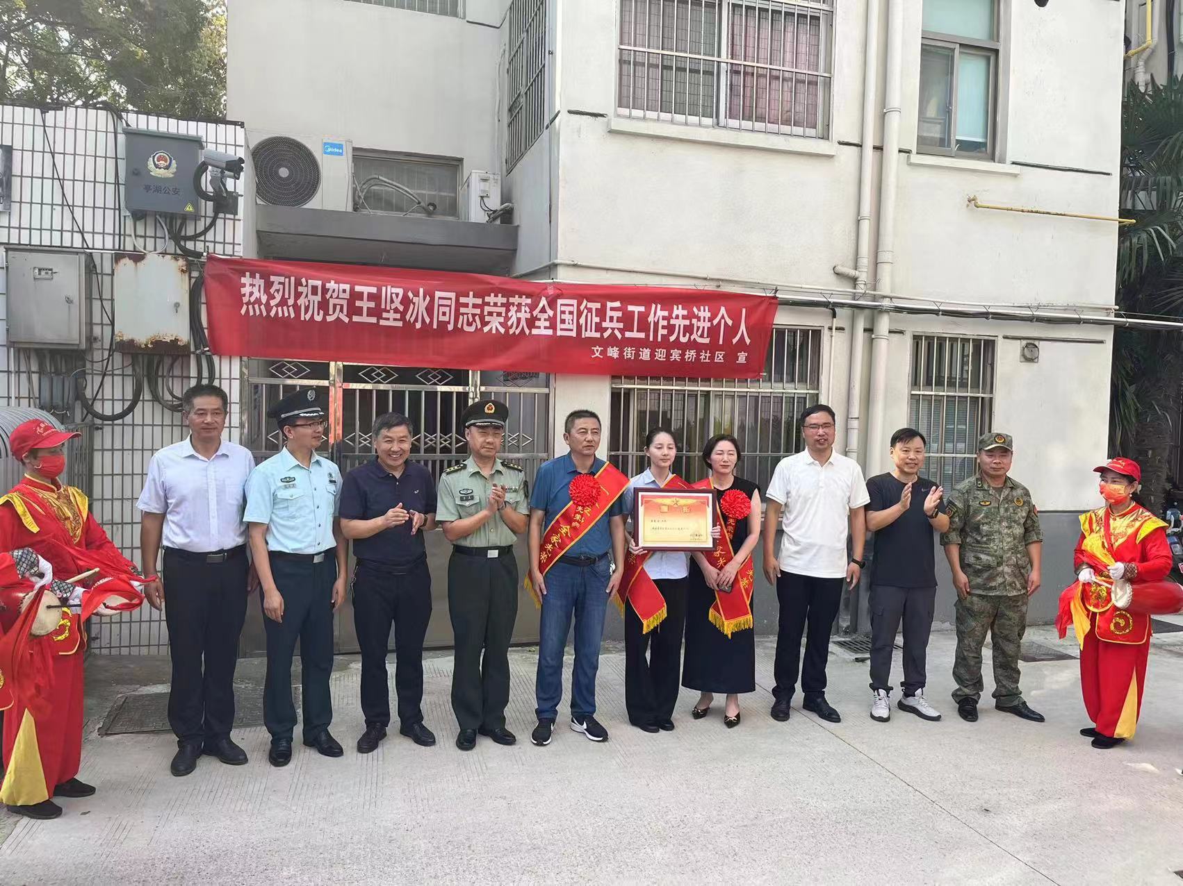 新华报业网讯 9月8日上午9点,盐城市亭湖区文峰街道迎宾桥社区内一片喜气洋洋。亭湖区人武部、区退役局、文峰街道人武部、迎宾桥社区退役军人服务站及社区工作人员组成送喜报队伍,前往全国征兵工作先进个人王坚冰的家中,为其送上一份沉甸甸的荣誉与祝福。
