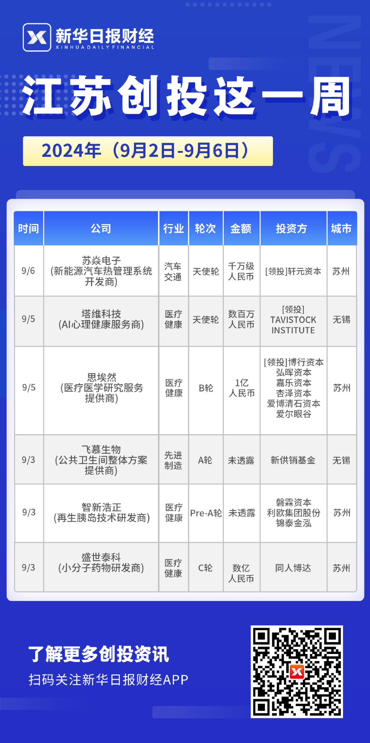 新华日报财经讯 本周(9.2-9.6),江苏共发生投融资事件6起,已披露的投融资总额超3亿元。从行业分布来看,医疗健康4起,汽车交通、先进制造各1起。从投资轮次来看,天使轮2起,Pre-A轮、和A轮、B轮、C轮各1起。从地域分布来看,苏州4起、无锡2起。