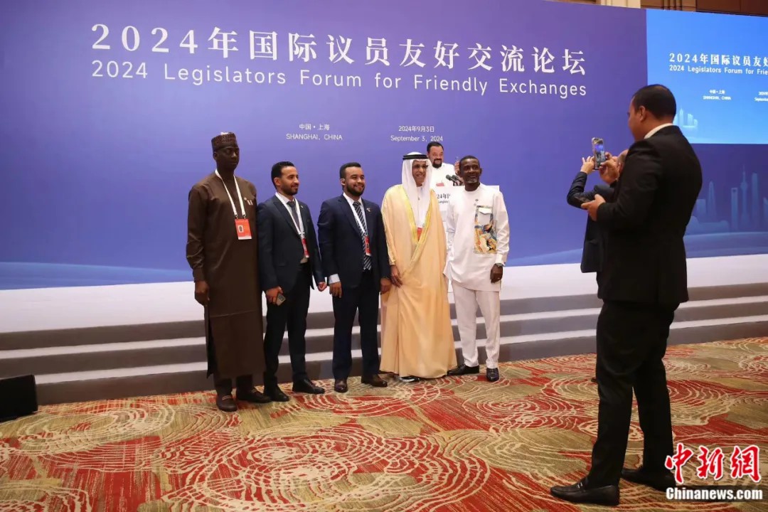 9月3日,尼日利亚联邦众议院尼中关系委员会主席贾法鲁·雅库布(左一)在2024年国际议员友好交流论坛开幕式后合影留念。中新社记者 张亨伟 摄