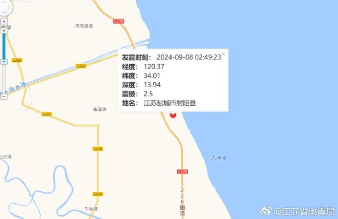 江苏地震台网正式测定:2024年9月8日02时49分在江苏盐城市射阳县(北纬34.01度、东经120.37度)发生2.5级地震,震源深度14千米。
