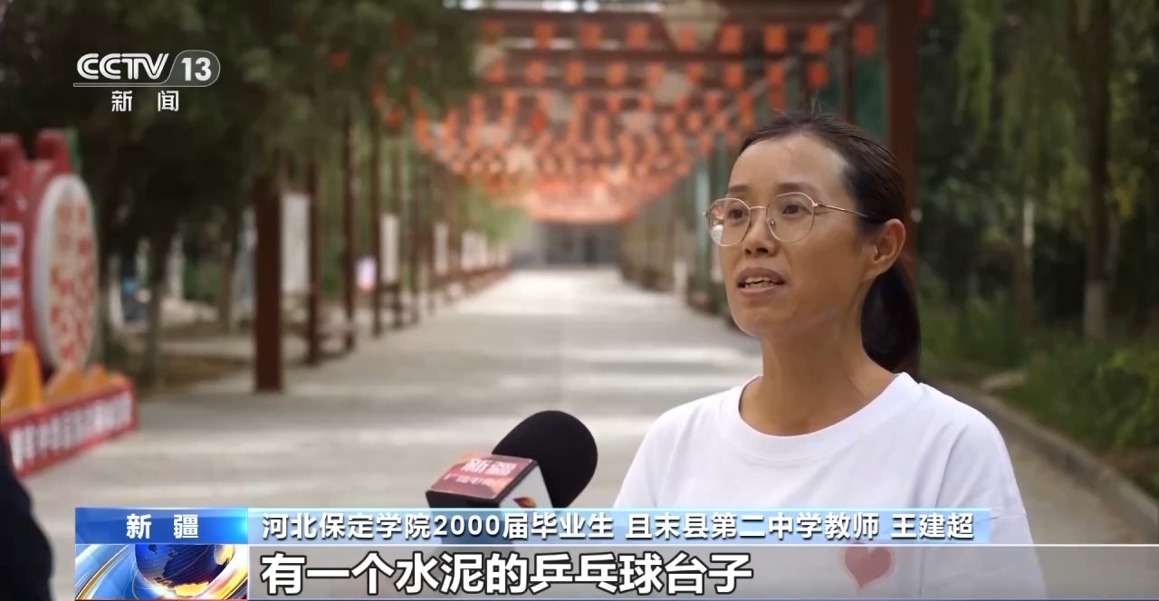 河北保定学院2000届毕业生 且末县第二中学教师 王建超:到这之后一看,只有半个篮球场,有一个水泥的乒乓球台子。