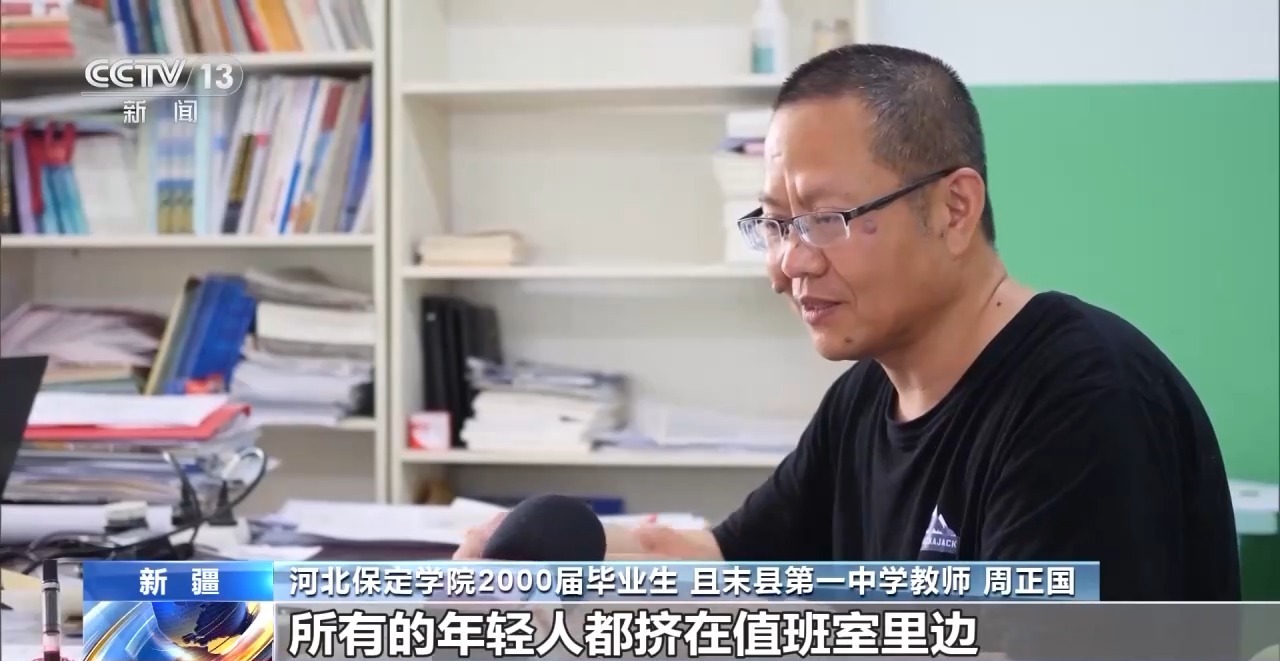 河北保定学院2000届毕业生 且末县第一中学教师 周正国:没有什么娱乐设施,唯一一个小电视就在值班室,所有的年轻人都挤在值班室里边,值班室有一张床,大家为了争坐这个床,把床坐塌了。
