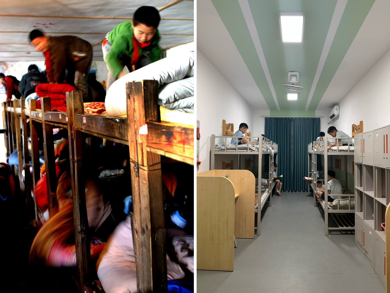40多平方米的房间里放了二十几张高低铺床,要睡下六七十个孩子。两个一年级的孩子挤一张80厘米宽的床;三个二年级的孩子睡两张拼接在一起的铺位。夜里上厕所得在黑暗中跨过一双双腿,经常把大半个寝室的同学吵醒。而所谓厕所,就是墙角的两个木头马桶。