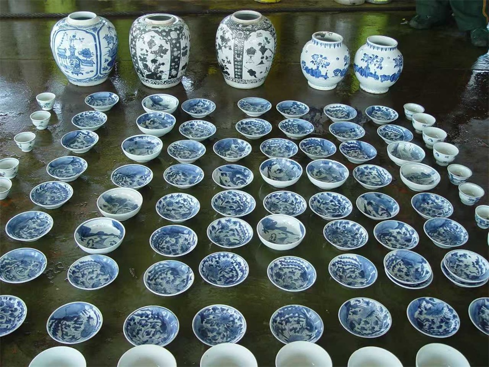 林馨舟:其中大部分是青花瓷,还有少量五彩器、单色釉器,也不乏青花釉里红器,可以说这是一座难得的水下瓷器宝库。这些出水瓷器质量上乘、胎质坚硬、釉色莹润、器型多样、纹饰丰富,它们代表了清早期中国民窑瓷器的最高水平,而且还带有鲜明的异域特色,有一些明显是定制化烧造的,体现了中西审美的融合。