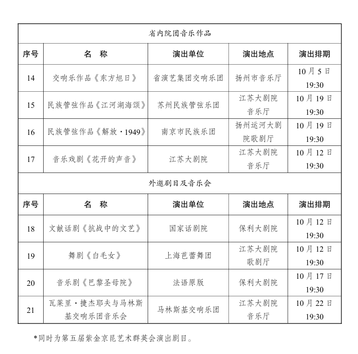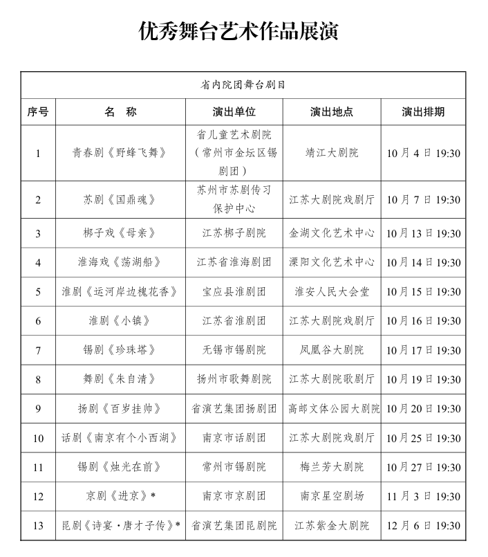 为庆祝中华人民共和国成立75周年,优秀舞台艺术作品展演、优秀艺术作品展览将集中与观众见面。10月,21部荣获国家和省级大奖并入选国家艺术基金等创作扶持计划的文艺精品,以及一批弘扬中华优秀传统文化且在市场上广受好评的传统经典作品,将逐一呈现在观众面前。其中既有我省文艺院团倾力打造的苏剧《国鼎魂》、淮剧《小镇》、舞剧《朱自清》、昆剧《诗宴·唐才子传》等,也有国家话剧院带来的文献话剧《抗战中的文艺》、法语原版音乐剧《巴黎圣母院》等外邀剧目。展览方面,奋进新时代——江苏省庆祝中华人民共和国成立75周年美术书法作品展、大道之行——庆祝中华人民共和国成立75周年江苏省美术作品展、“新中国新发现”江苏书法主题作品展、“国士之风”致敬国家荣誉称号获得者主题雕塑创作展也将一一登场。
