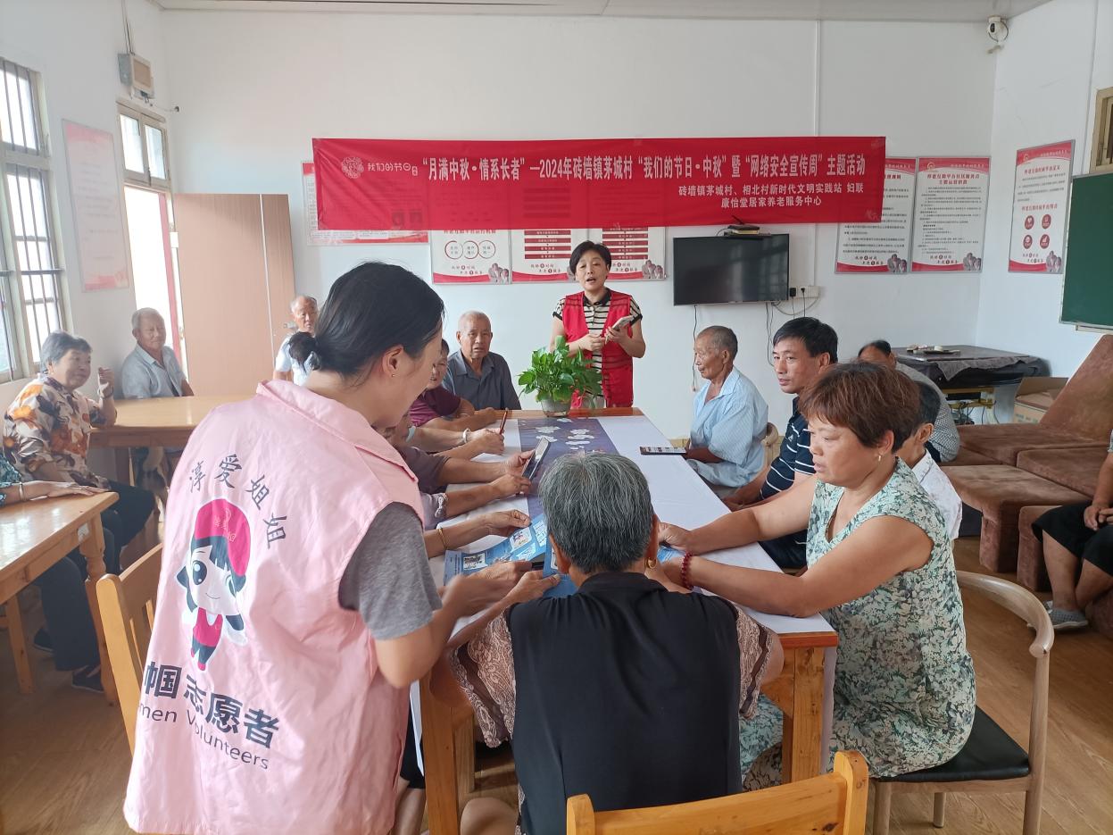 为弘扬尊老、敬老、爱老、助老的社会风尚,营造和谐温馨的节日氛围,9月11日,砖墙镇茅城村、相北村新时代文明实践站、妇联联合康怡堂茅城居家养老服务中心,共同举办了“月满中秋 情系长者”中秋主题活动暨“网络安全宣传周”主题活动。本次活动特别邀请了辖区内退役老兵、老党员、残疾老人参加。