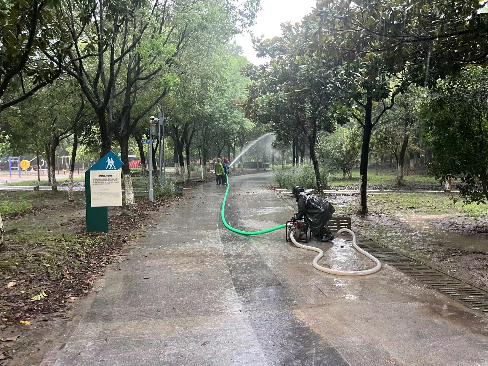 东方园林公司积极落实排查各公园及管护路段防汛工作,明确责任人加强巡查值守,进行各公园用电安全检查;组织园林工人及时清理路段折枝、倒伏树木,确保市民出行安全,对积水路段安排人员疏通下水道,做好清污排水等措施,排除雨水带来的险情;对关键区域的配电箱和路灯进行断电处理,以防泡水损坏及漏电危险;对公园广场积水区域进行排涝,并对游园内的设施、水体等进行检查,及时排除安全隐患。同时,组织人员加强巡逻,全面落细落实各项防汛措施,坚决维护人民群众生命财产安全,该公司共出动防汛应急人员60余人,抢险巡查车辆6台,抽水泵5台。