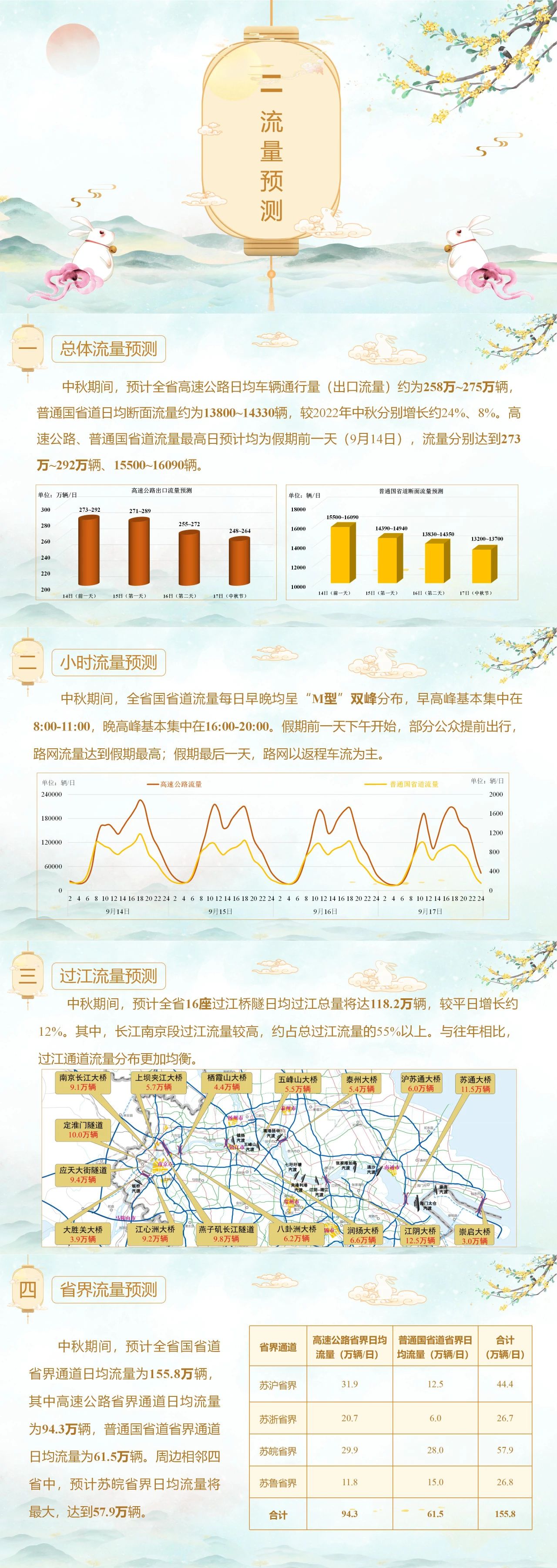 交汇点讯 9月13日,新华日报·交汇点记者从江苏省交通运输厅获悉,中秋假期,预计全省高速公路日均车辆通行量(出口流量)约为258万~275万辆,普通国省道日均断面流量约为13800~14330辆,较2022年中秋假期分别增长约24%、8%。高速公路、普通国省道流量最高日预计均为假期前一天(9月14日),流量分别达到273万~292万辆、15500~16090辆。