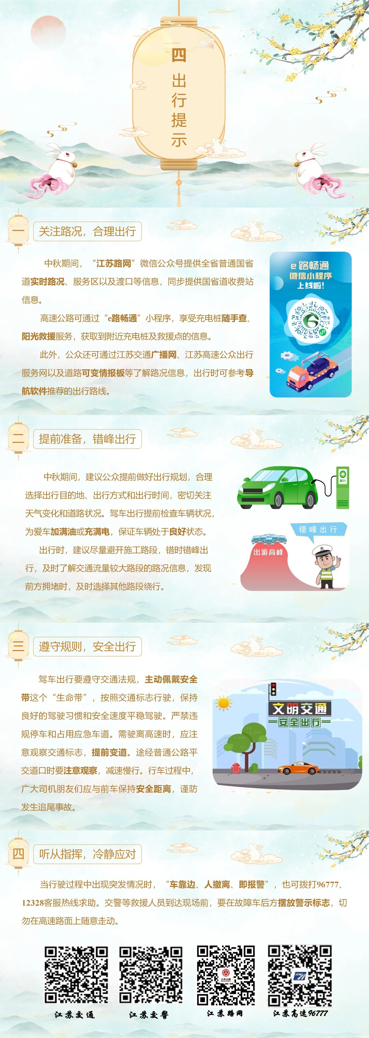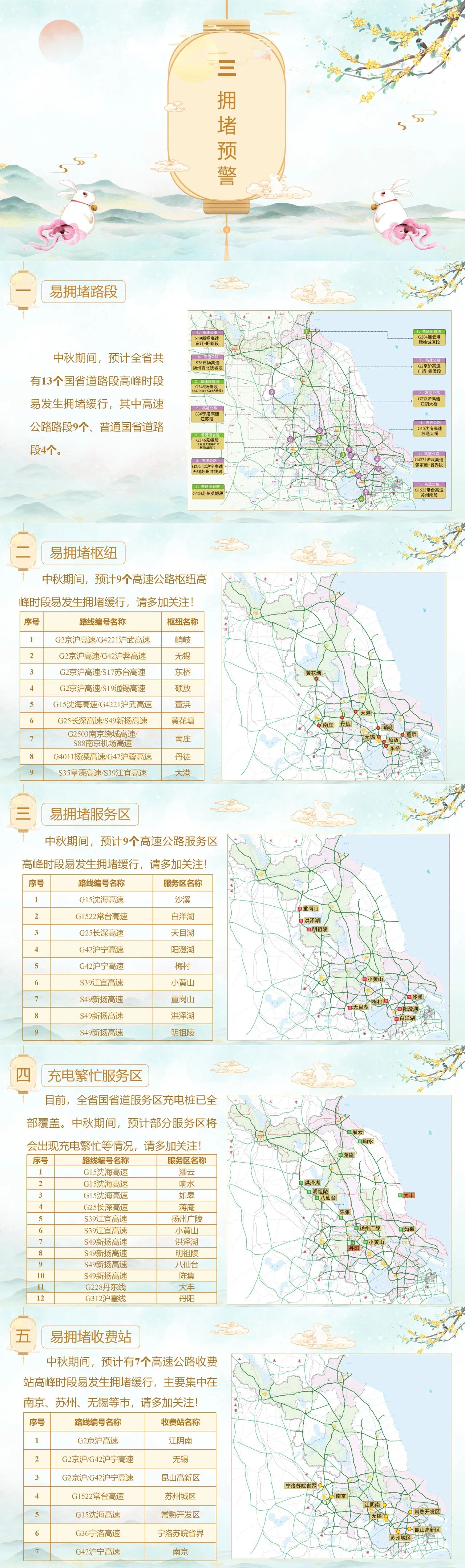 温馨提示,假期高速公路七座及以下小型客车通行不免费。此外,全省普通国省道有26个全封闭施工路段,其中苏北地区7个、苏中地区6个、苏南地区13个,请过往车辆驾驶人员谨慎通行或提前绕行。