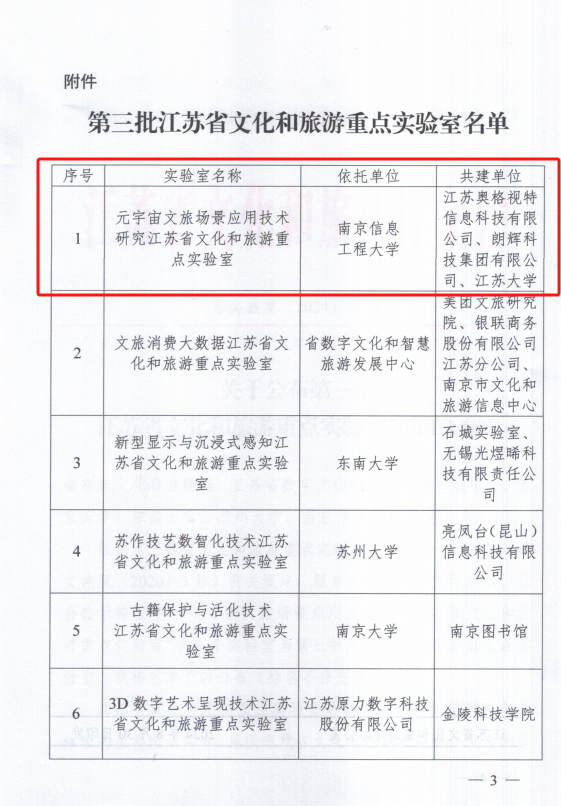 新华报业网讯 近日,江苏省文化和旅游厅公布了第三批江苏省文化和旅游重点实验室名单,江苏奥格视特信息科技有限公司参与共建的元宇宙文旅场景应用技术研究江苏省文化和旅游重点实验室成功获批。
