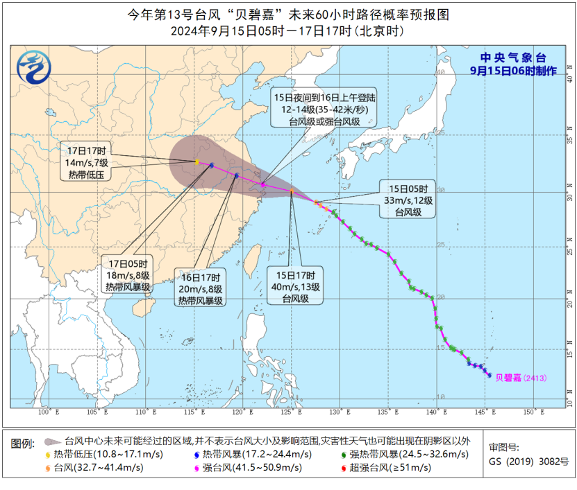 大风预报:9月15日08时至16日08时,东海大部、黄海南部、浙江东北部、上海、江苏东南部将有6-8级、阵风9-10级的大风,东海北部部分海域、上海沿海、江苏东南部沿海、杭州湾、长江口区、舟山群岛附近海域将有9-11级、阵风12-13级的大风,“贝碧嘉”中心经过的附近海域或地区风力可达12-14级、阵风15-16级。