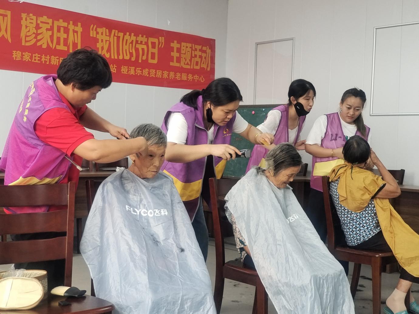 在理发区域,理发师认真询问老人们对发型的要求,专注细致地进行修剪,一个个干净利落的发型让老人止不住地夸赞。