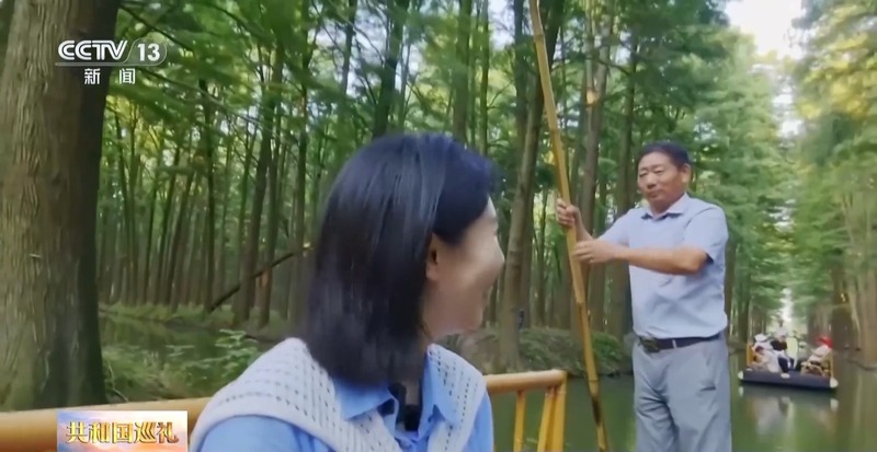 撑船师傅:我们这边原先鸟不多,种出来这片森林以后,鸟开始增多了,现在有十几万只。水中有鱼,林中有鸟,这里是一个森林氧吧,负氧离子非常高,每年我们接待80万人左右——水上森林走一走,想活多久就多久!
