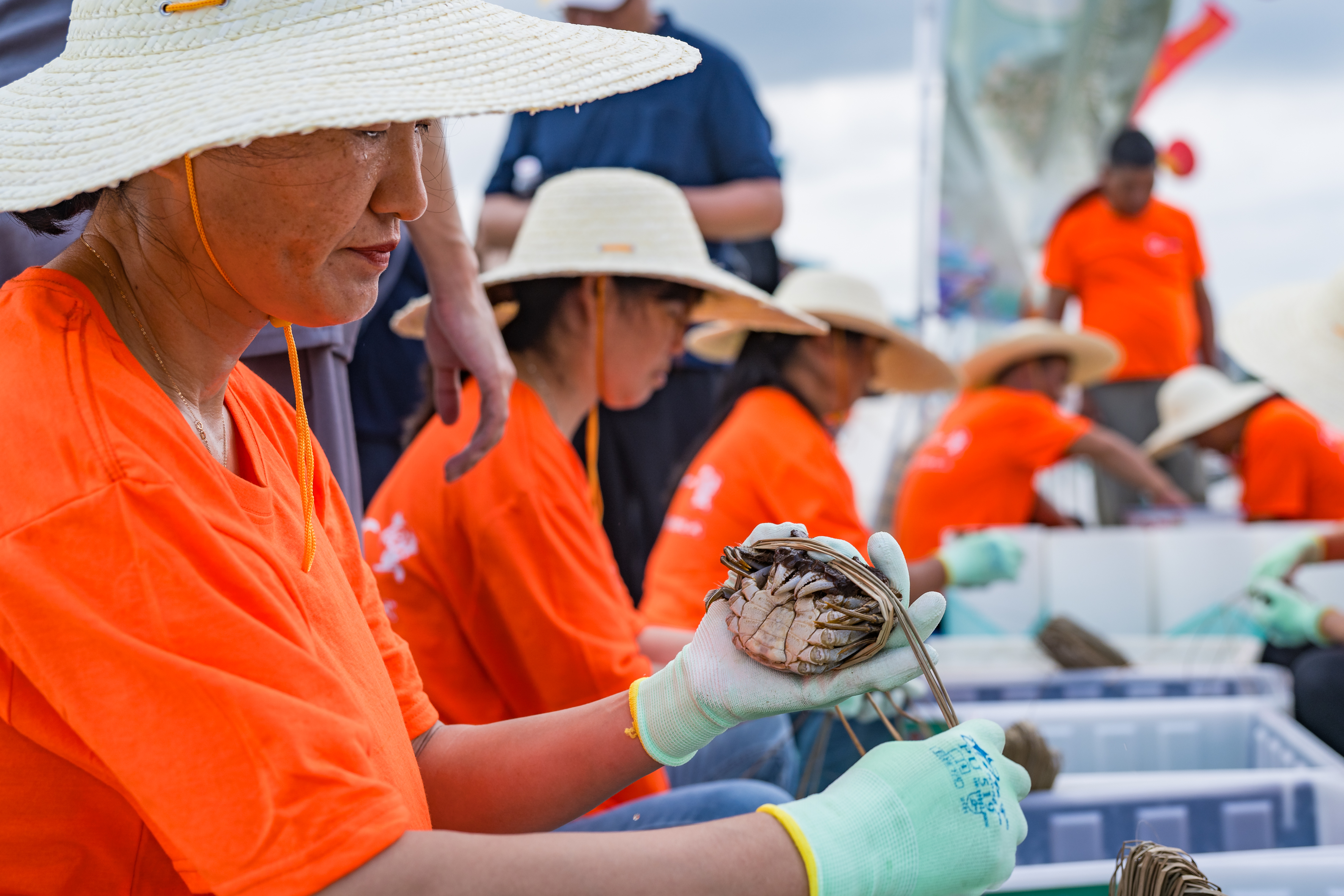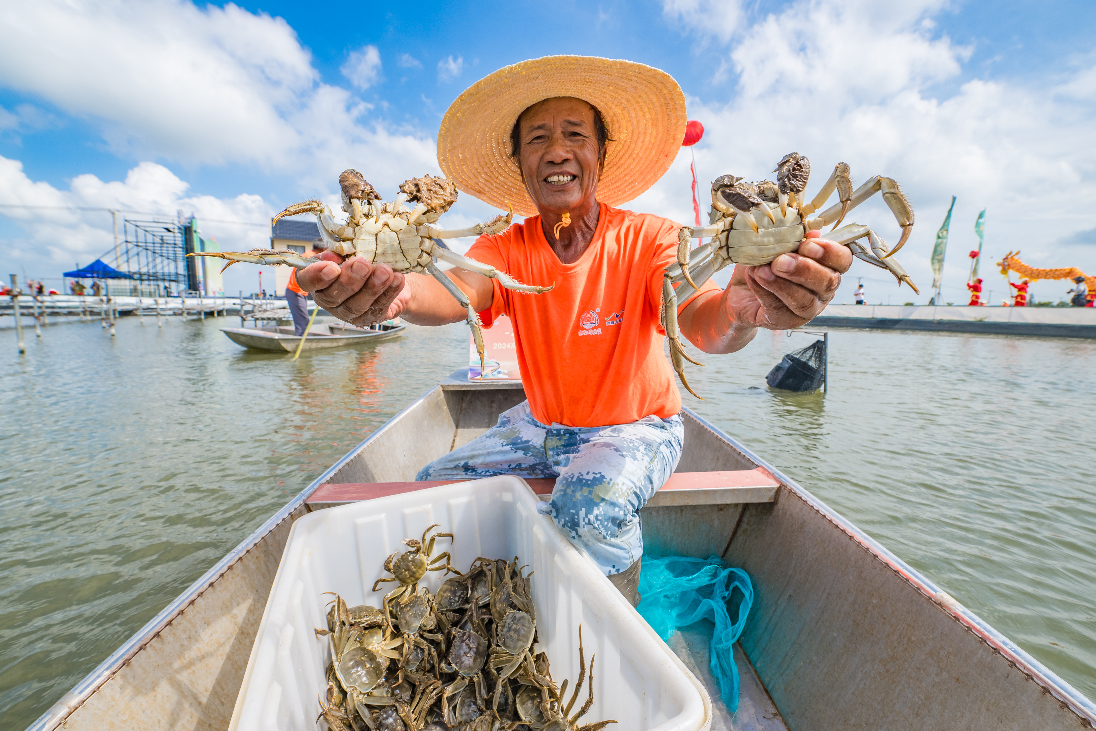 “一网下去,收获满满!”活动现场,蟹农们难掩激动,将一只只体态饱满、青背白肚的螃蟹捕捞上岸,接着迅速分拣验蟹、扎蟹装箱,远道而来的游客们纷纷拿出手机拍摄记录,一同分享丰收的喜悦。
