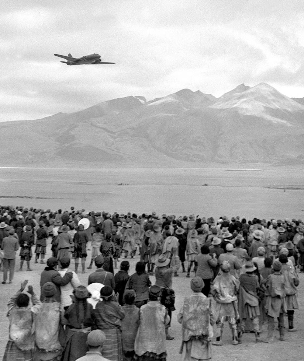 1956年,从北京出发的飞机飞临在拉萨附近机场上空时,受到藏族人民的热烈欢迎。新华社记者钱嗣杰摄