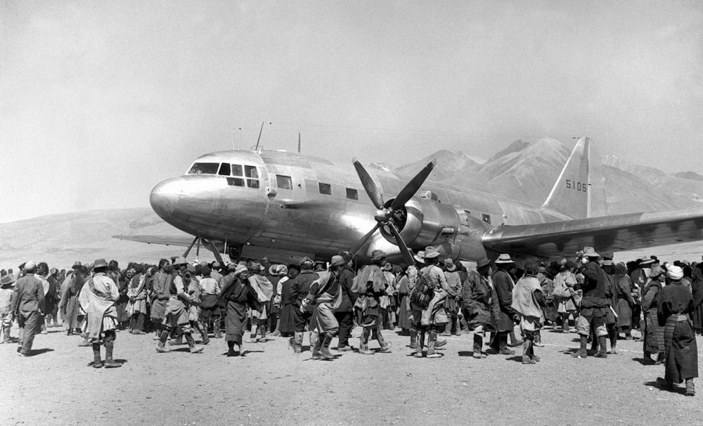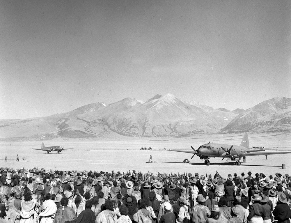 1956年,从北京出发的飞机在机场降落。受到藏族人民的热烈欢迎。新华社记者钱嗣杰摄
