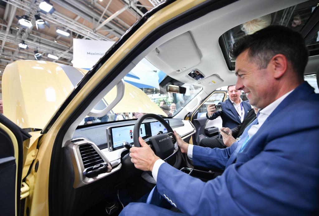 9月16日,在德国汉诺威国际交通运输博览会媒体预展上,一名男子体验上汽大通eTerron 9纯电皮卡车。新华社记者任鹏飞摄