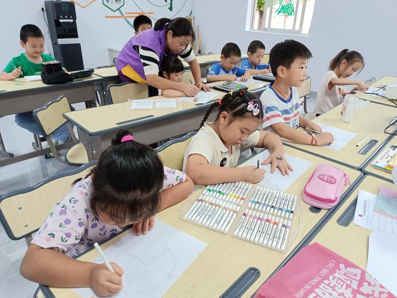 分享完心中的热血,学生们在志愿者的指导下开始绘制手抄报,先根据主题认真地描绘出轮廓图案,后用黑色勾线笔进一步勾画,再用自己喜欢的颜色涂色,随后完善细节,写上美好祝愿的创意文字。学生们把自己对祖国的热爱绘入图画和文字当中,表达自己对祖国美好的祝愿。