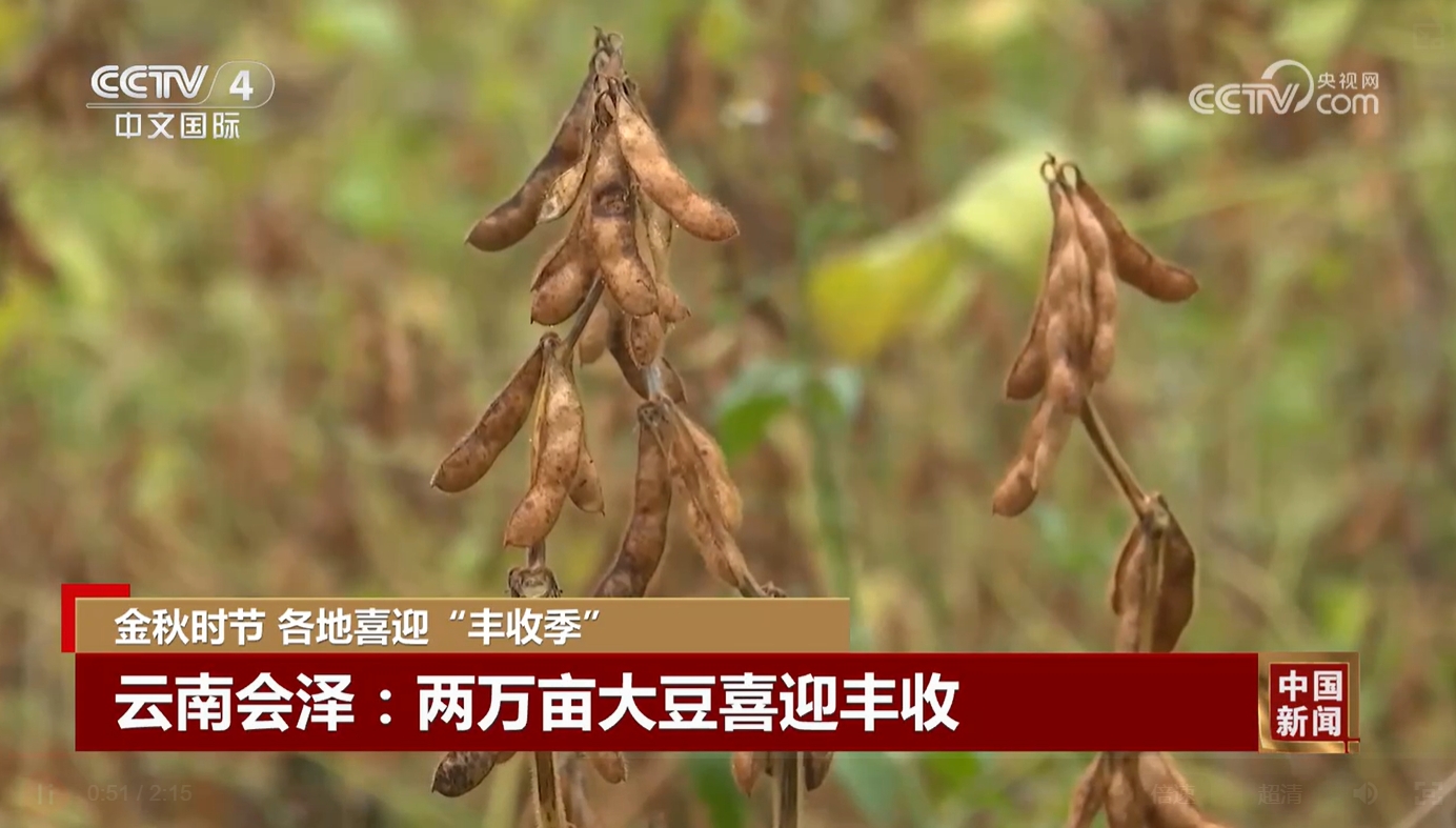 在乌蒙山间的云南会泽县,两万多亩大豆喜迎丰收。在当地的大豆种植示范区里,金黄的豆叶汇聚成一片金色海洋,饱满圆润的大豆荚挂满枝头。