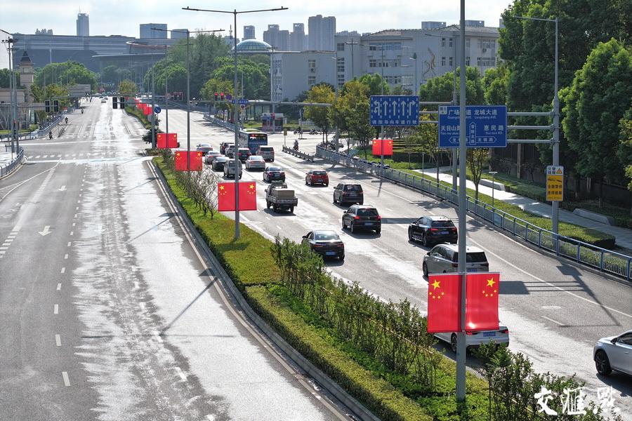 国庆将至,江苏各地大街小巷、广场景点挂国旗、挂灯笼、布置主题花坛,喜庆祥和的节日氛围渐浓,盛装喜迎新中国成立75周年。