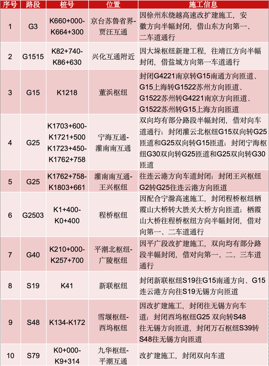 施工路段——10处施工路段节点封闭或借道