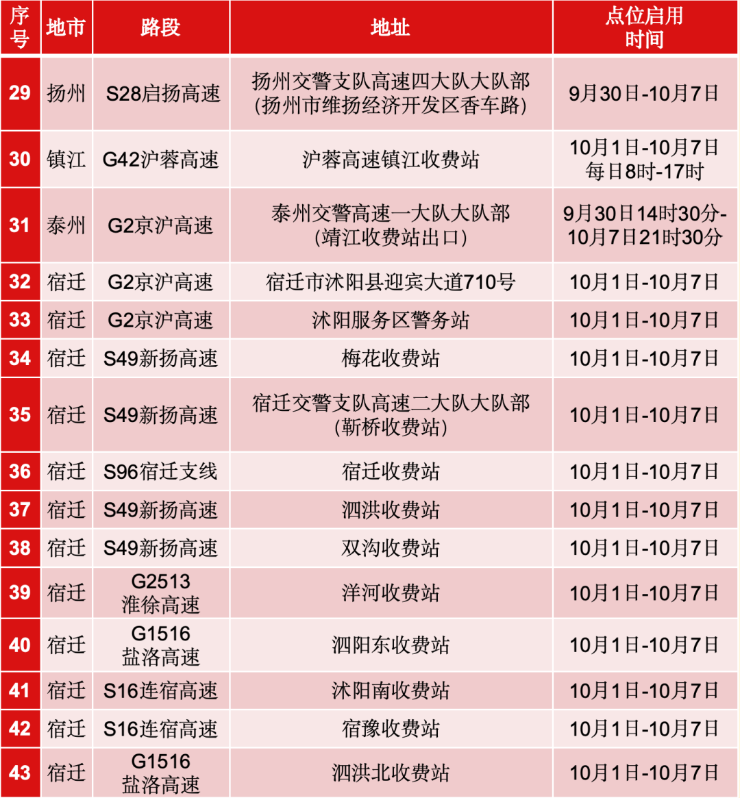 国庆期间,江苏高速在全路网设置43个事故快处快赔服务点,方便快速处理轻微事故。此外,用户还可通过“交管12123”APP 和“江苏高速96777”微信公众号等渠道,进行线上快处快赔。同时,高速公路服务区警务站在节假日期间将加大涉车涉路违法犯罪行为查处打击力度。
