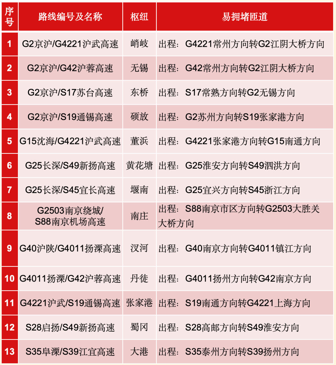 国庆期间,预计全省高速公路有13个枢纽因大流量、中长途出行多等因素高峰时段易发生拥堵缓行,请多加关注!