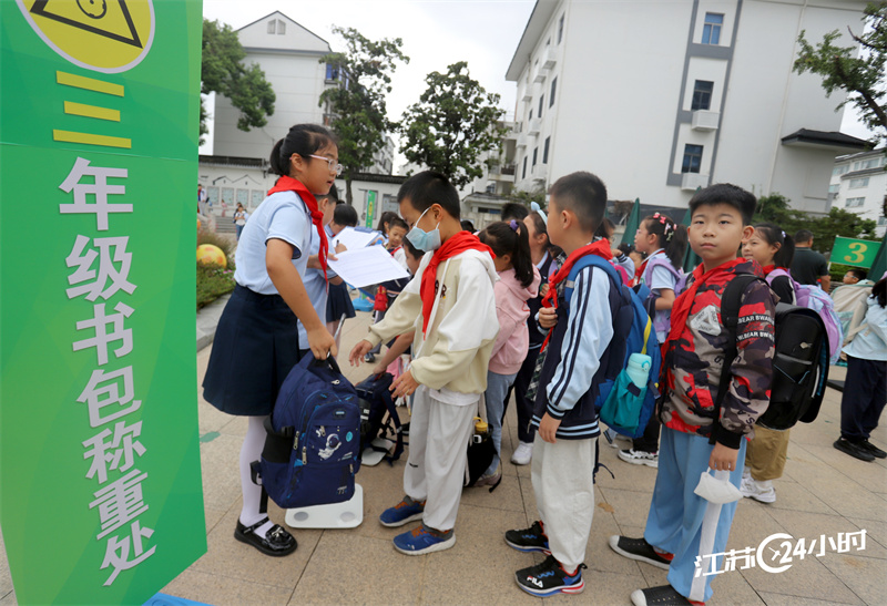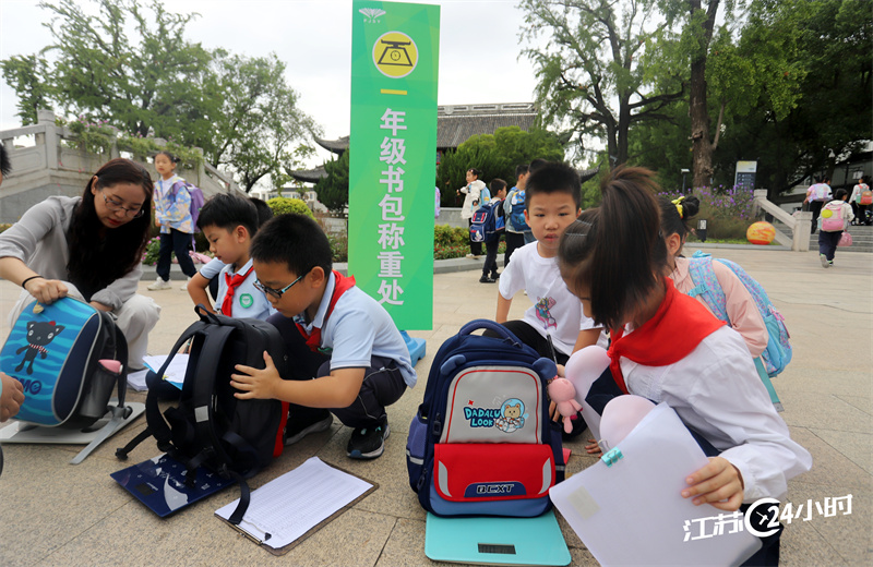 (特约摄影 王建康 8:02摄 9:45上线)9月26日,苏州市平江实验学校在学校门口给学生的书包称重,提醒孩子为书包“瘦身”。
