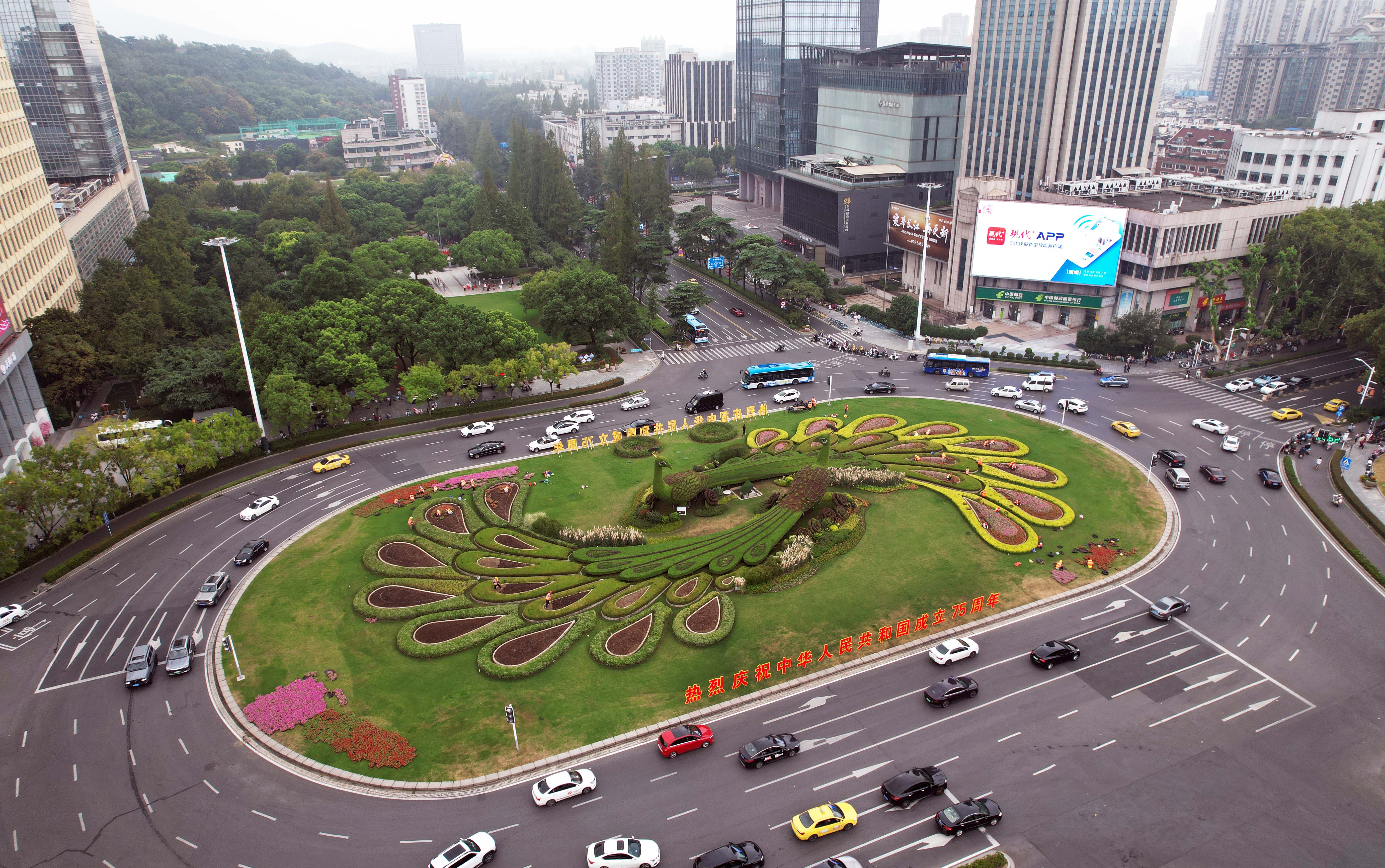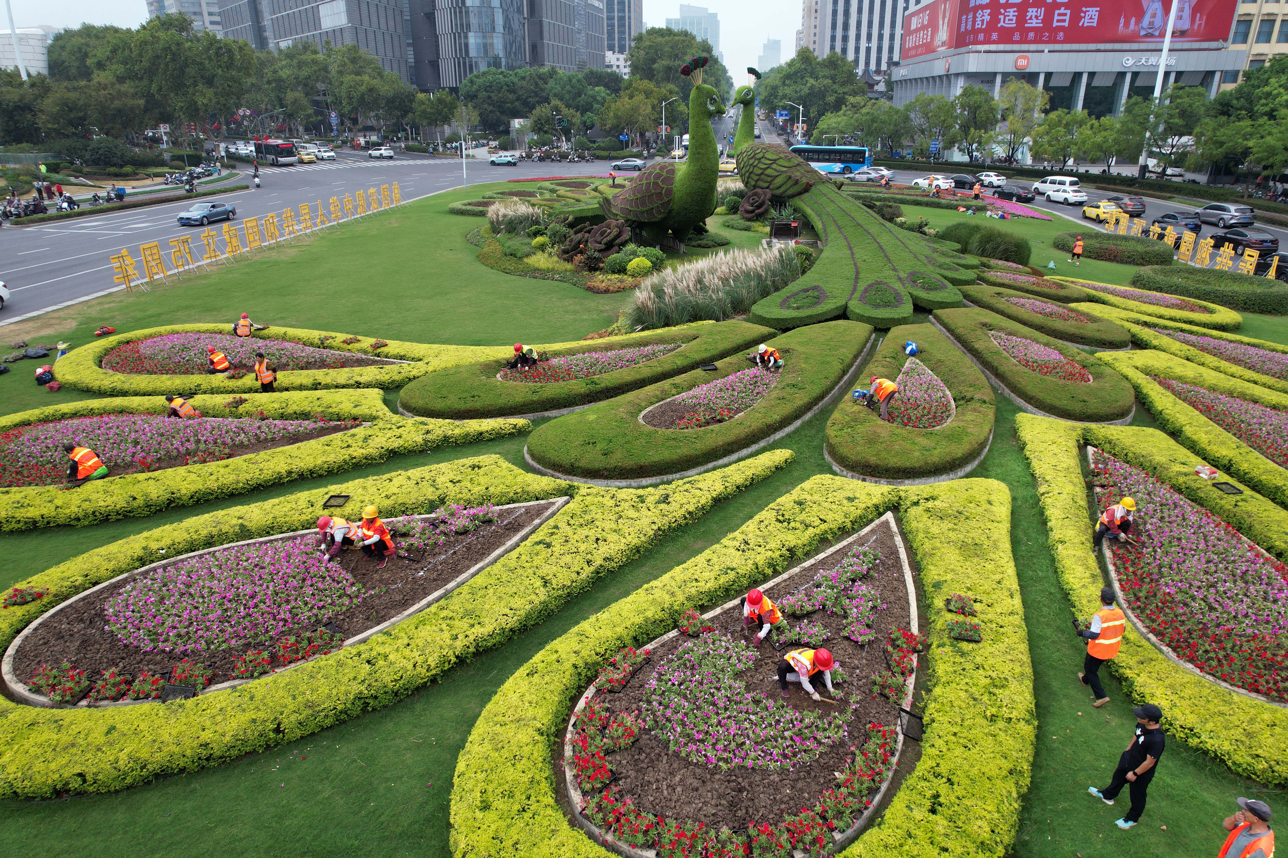 (记者 宋宁 11:12摄 14:15上线)9月26日,工作人员在南京鼓楼广场中心环岛内,为孔雀绿雕更换花卉和绿植,并在两侧绿地处用花盆布置喜庆图案。鼓楼广场洋溢喜庆氛围。