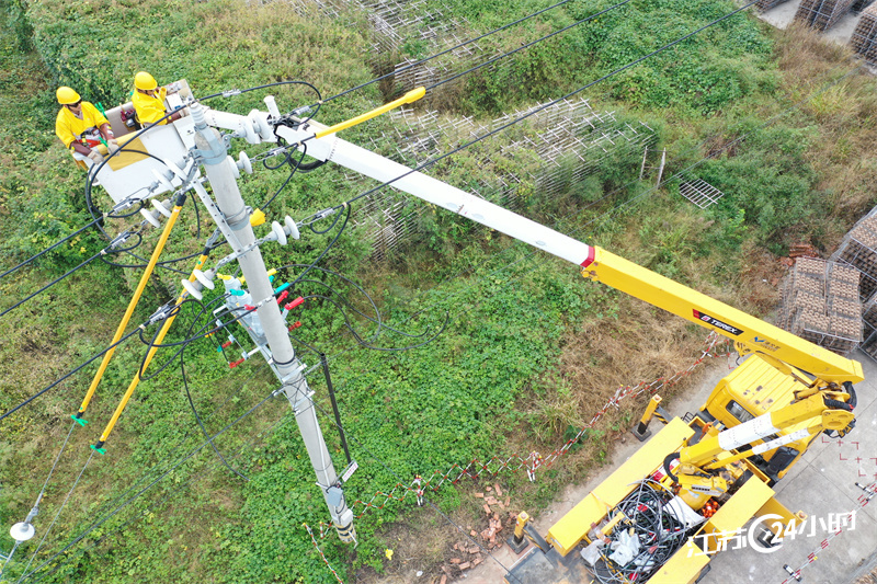 (特约摄影 刘彬 8:17摄 8:50上线)9月26日,工作人员在淮安市洪泽区东双沟镇第二工业集中区农电专线,更换安装高压真空分流断路器,确保生产生活用电,提高农村电网智能化管护质效。