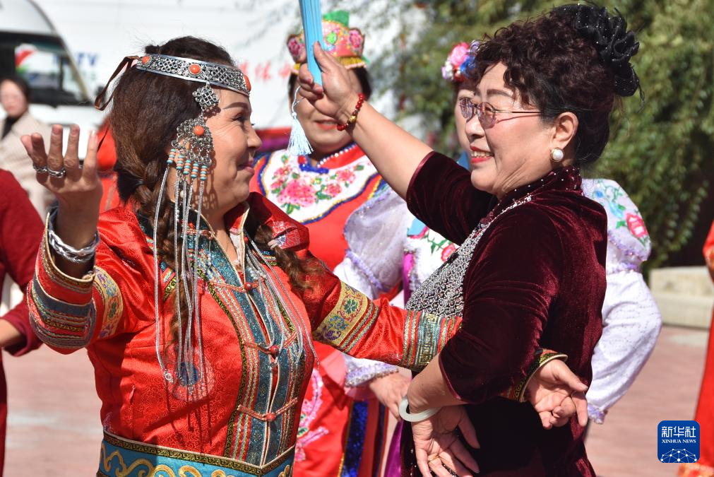 9月27日,在新疆塔城市新城街道哈尔墩社区举行的“邻里节百家宴”现场,社区居民在表演。