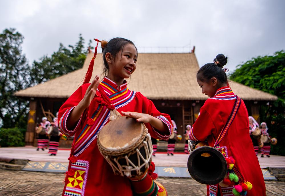 2022年7月6日,云南澜沧拉祜族自治县班利村的小演员为游客表演。新华社记者江文耀 摄